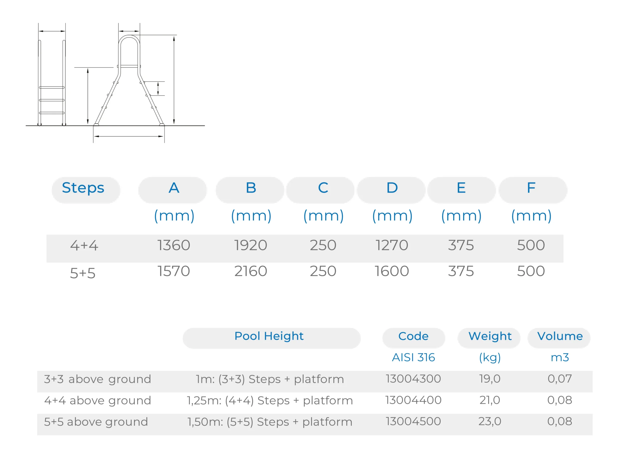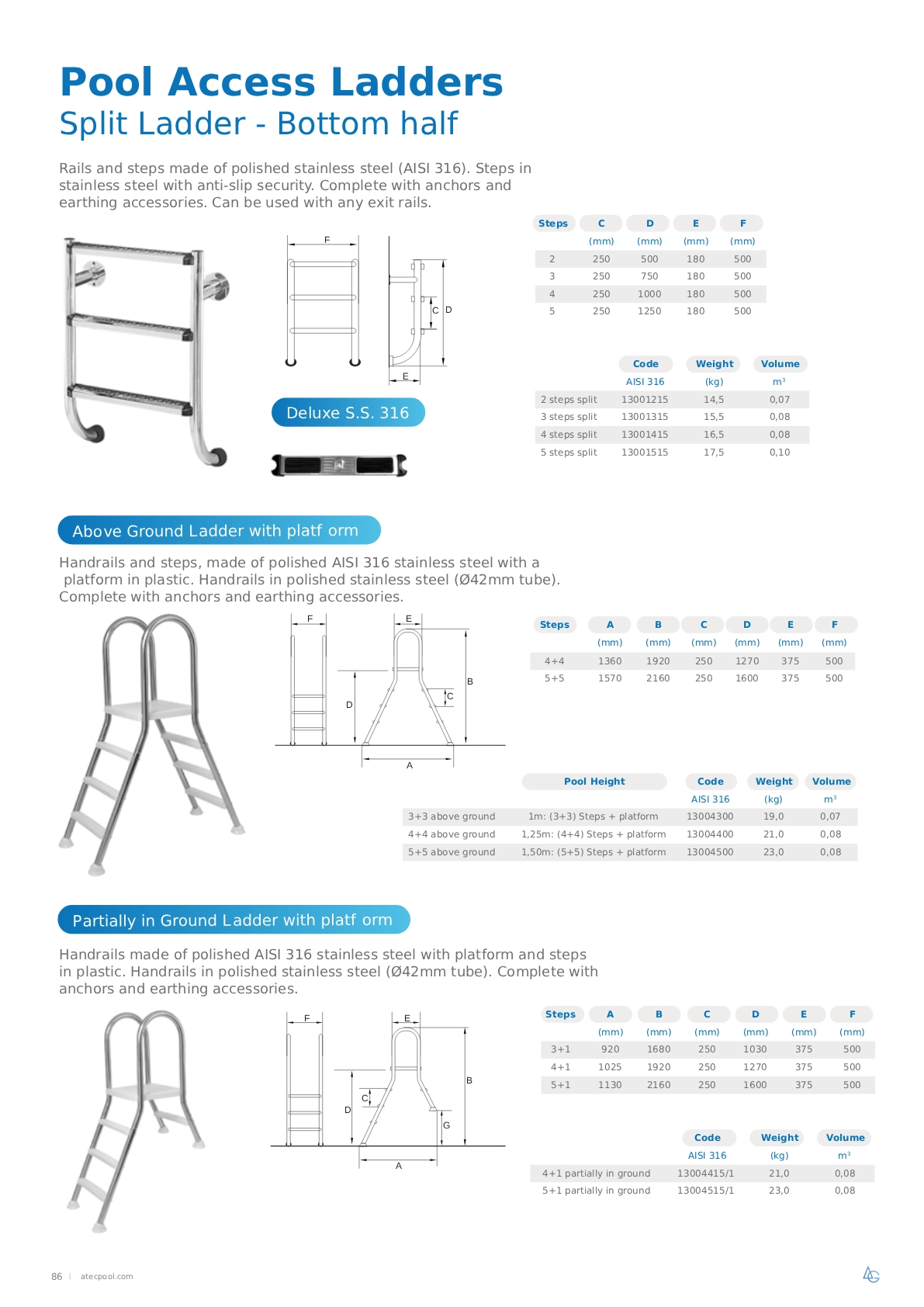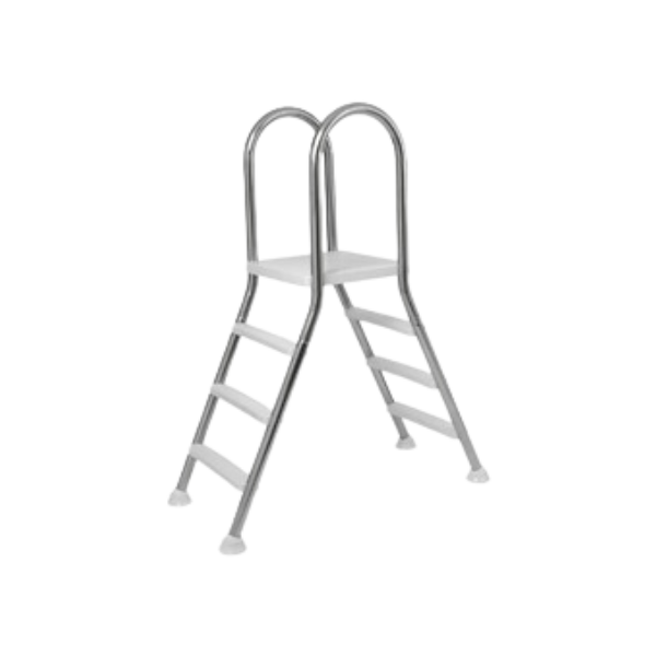 Handrails and steps, made of polished AISI 316 stainless steel with a platform in plastic. Handrails in polished stainless steel (Ø42mm tube). Complete with anchors and earthing accessories.