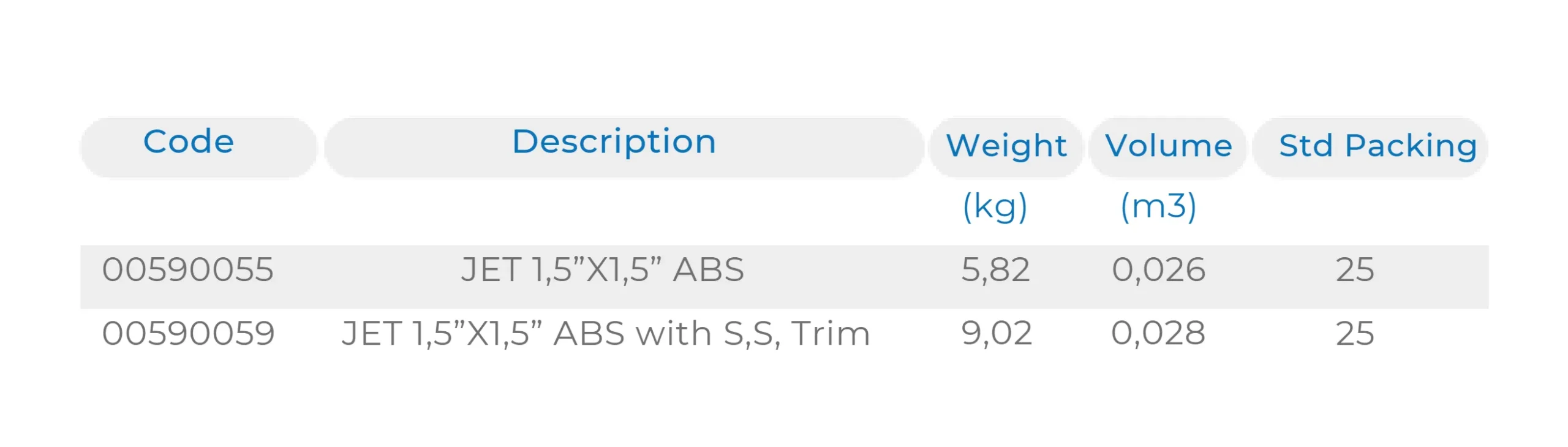 Made of white ABS for perfect gluing to PVC pipes. Ø50mm water inlet and air inlet. Flow – 4.5 m³/hr. Unique design permits for a combination of air and water massage by way of a venture system. Atmospheric Pressure at 0.8 bar. Available with stainless steel AISI 316 trim