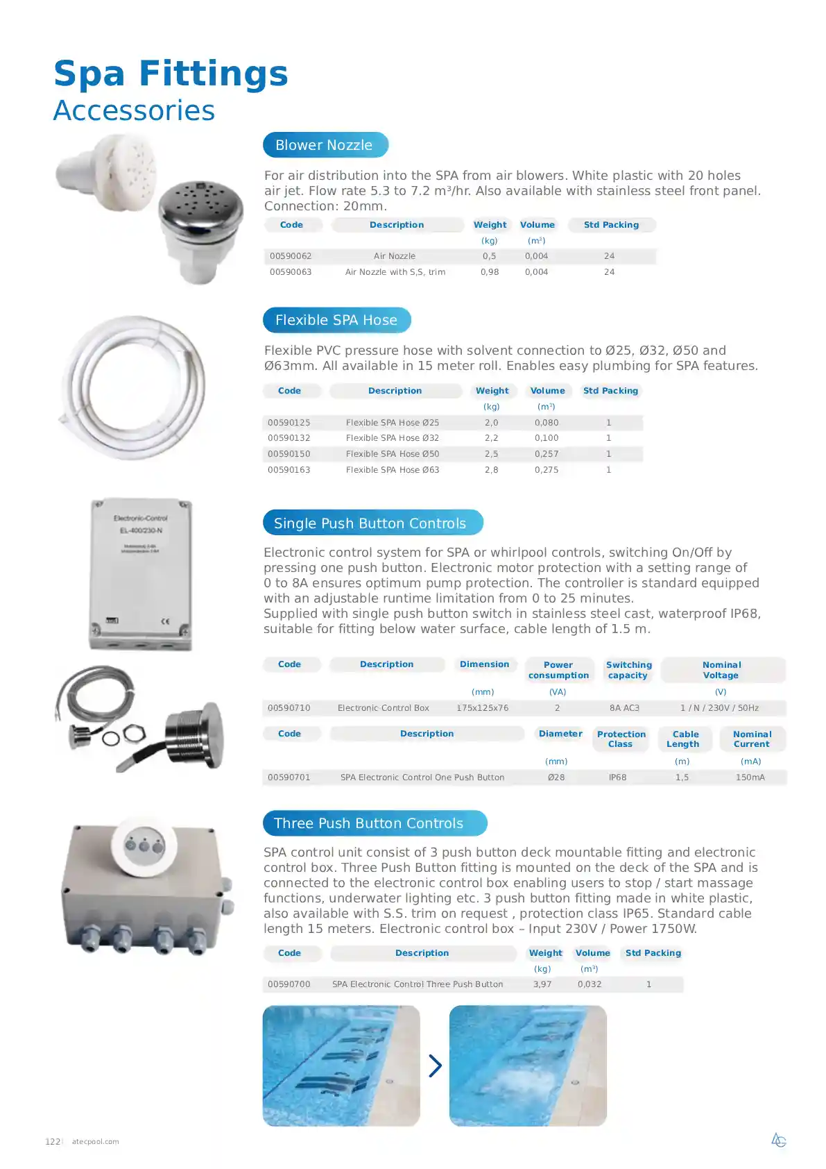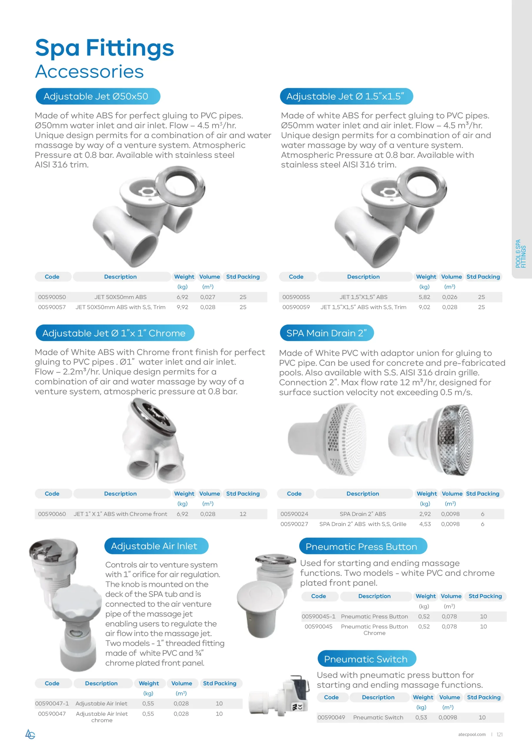 Made of White ABS with Chrome front finish for perfect gluing to PVC pipes . Ø1” water inlet and air inlet. Flow – 2.2m³/hr. Unique design permits for a combination of air and water massage by way of a venture system, atmospheric pressure at 0.8 bar.