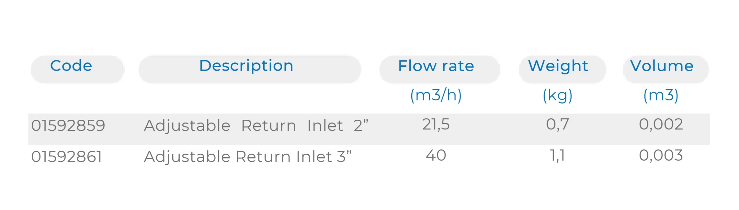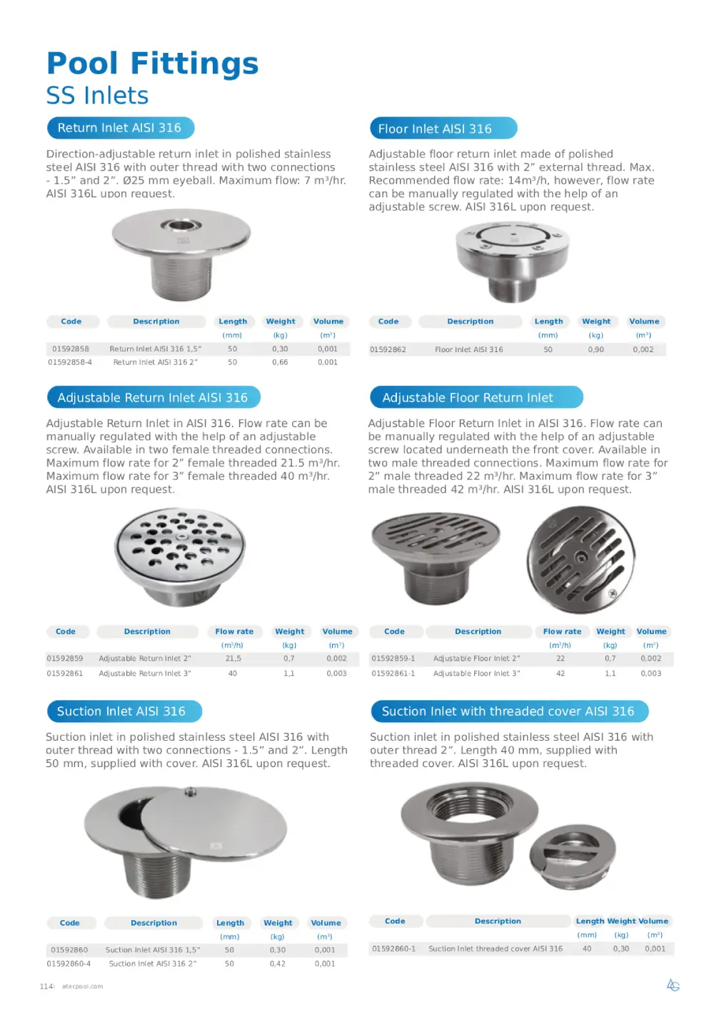 Adjustable Return Inlet in AISI 316. Flow rate can be manually regulated with the help of an adjustable screw. Available in two female threaded connections. Maximum flow rate for 2” female threaded 21.5 m³/hr. Maximum flow rate for 3” female threaded 40 m³/hr. AISI 316L upon request.