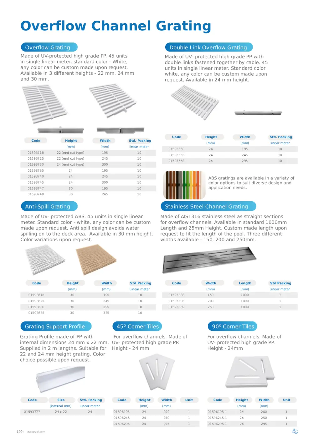 Made of UV- protected ABS. 45 units in single linear meter. Standard color – white, any color can be custom made upon request. Anti spill design avoids water spilling on to the deck area. Available in 30 mm height. Color variations upon request.