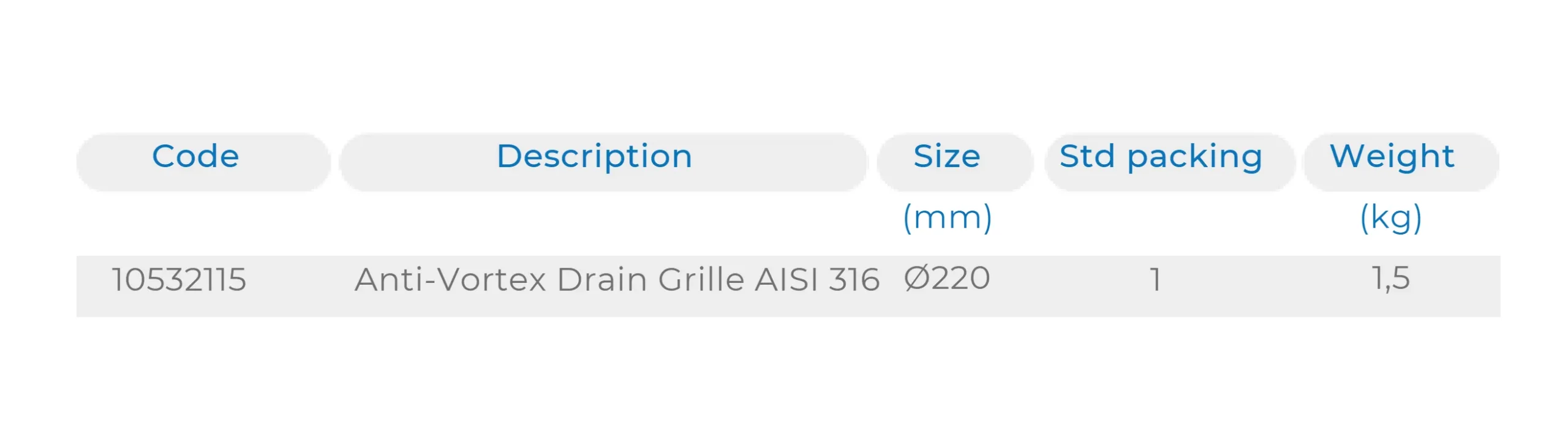 Support ring and circular grille Ø220mm made of stainless steel AISI 316. Supplied with grille Ø185mm and fixing screws. Recommended flow rate 14 m³/hr. AISI 316L upon request.