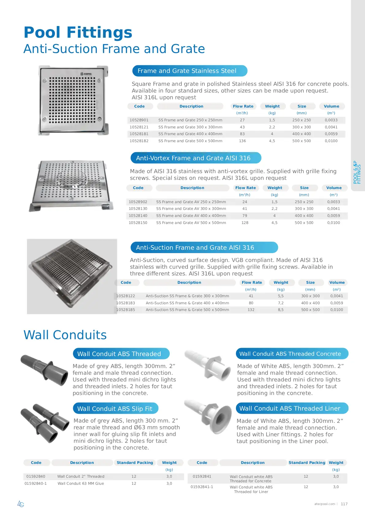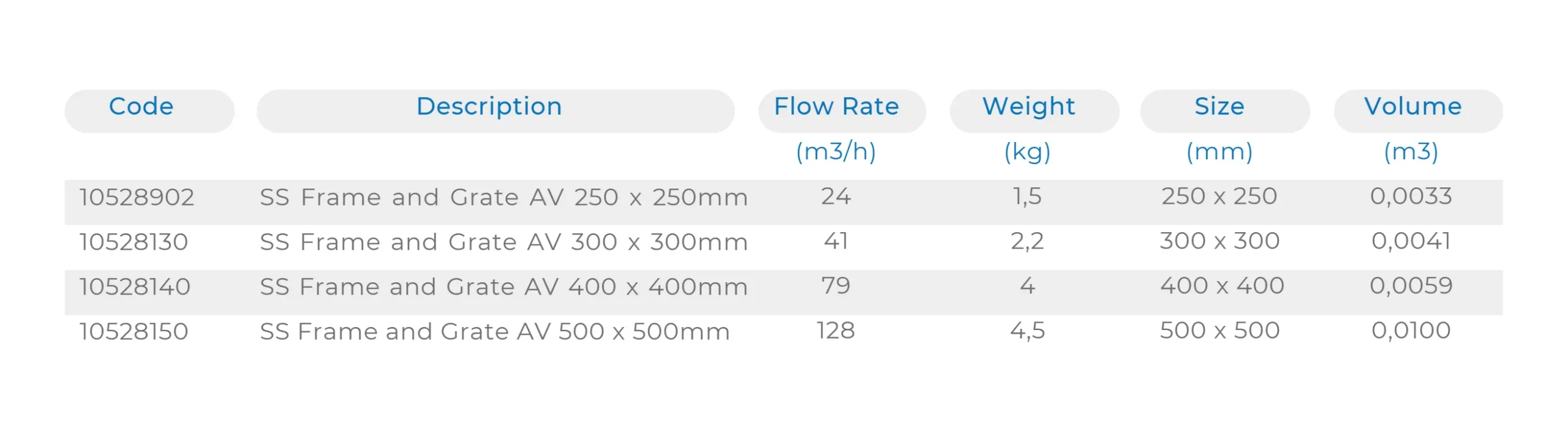 Made of AISI 316 stainless with anti-vortex grille. Supplied with grille fixing screws. Special sizes on request. AISI 316L upon request