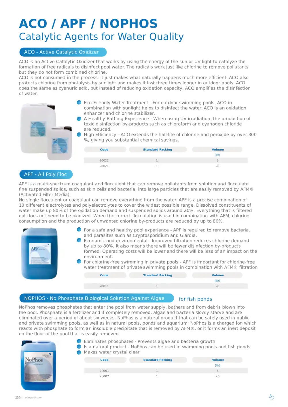 APF is a multi-spectrum coagulant and flocculent that can remove pollutants from solution and flocculate fine suspended solids, such as skin cells and bacteria, into large particles that are easily removed by AFM® (Activated Filter Media). No single flocculent or coagulant can remove everything from the water. APF is a precise combination of 10 different electrolytes and polyelectrolytes to cover the widest possible range. Dissolved constituents of water make up 80% of the oxidation demand and suspended solids around 20%. Everything that is filtered out does not need to be oxidized. When the correct flocculation is used in combination with AFM, chlorine consumption and the production of unwanted chlorine by-products are reduced by up to 80%.