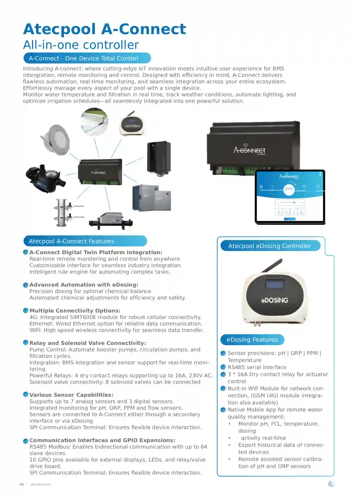 filtration cycles. Integration: BMS integration and sensor support for real-time monitoring. Powerful Relays: 4 dry contact relays supporting up to 16A, 230V AC. Solenoid valve connectivity: 8 solenoid valves can be connected - Various Sensor Capabilities: Supports up to 7 analog sensors and 3 digital sensors. Integrated monitoring for pH, ORP, PPM and flow sensors. Sensors are connected to A-Connect either through a secondary