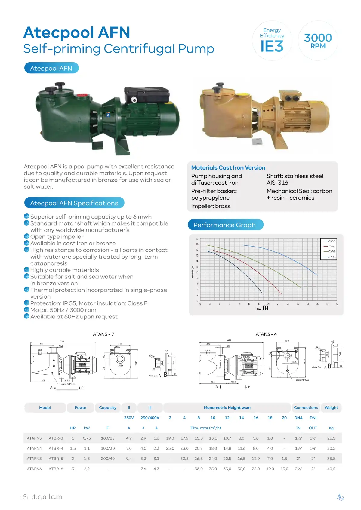 Atecpool AFN is a pool pump with excellent resistance due to quality and durable materials. Upon request it can be manufactured in bronze for use with sea or salt water.