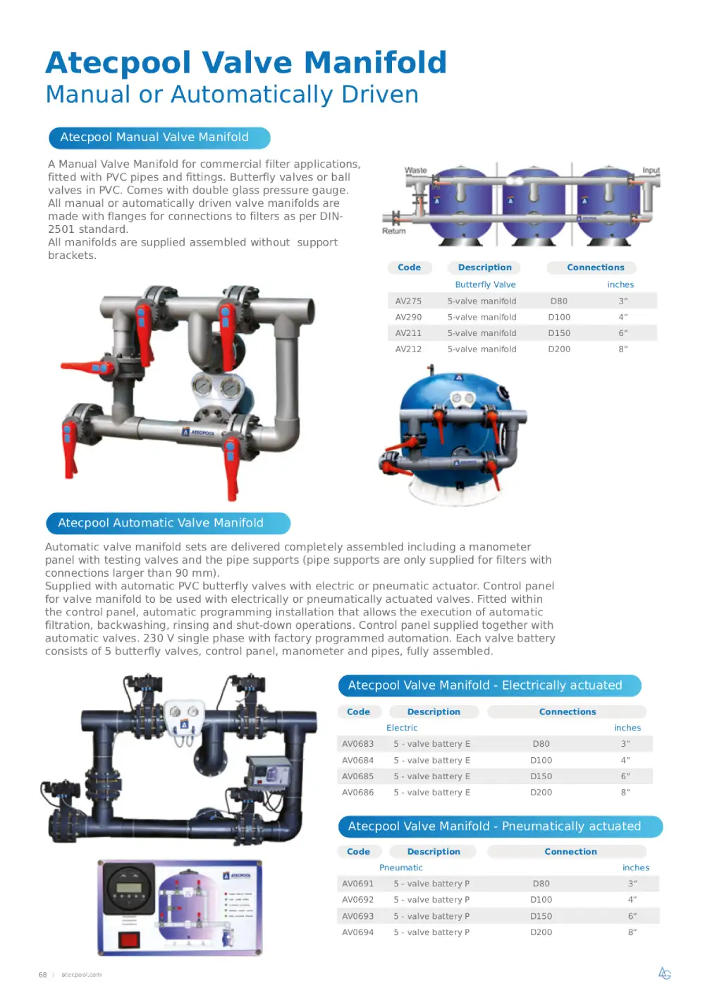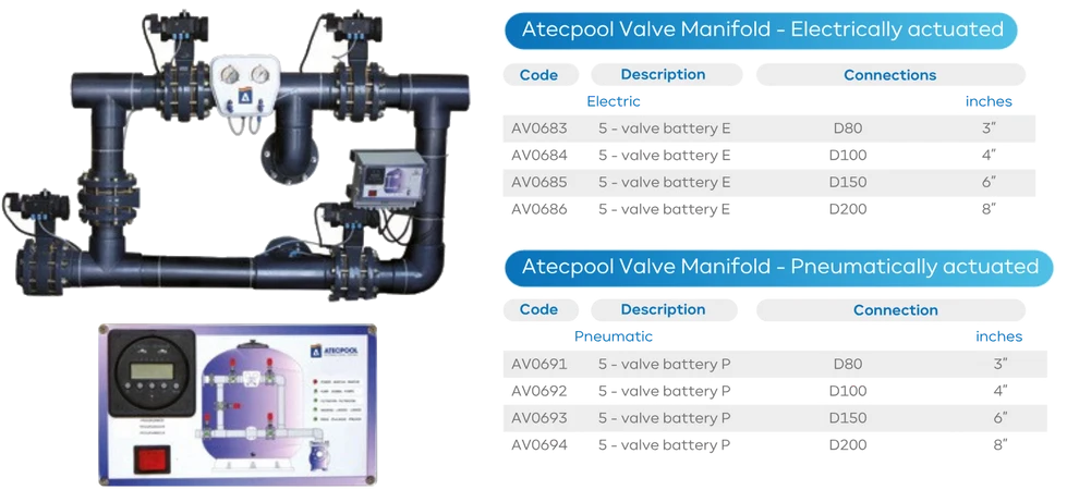 Supplied with automatic PVC butterfly valves with electric or pneumatic actuator. Control panel for valve manifold to be used with electrically or pneumatically actuated valves. Fitted within the control panel, automatic programming installation allows the execution of automatic filtration, backwashing, rinsing, and shut-down operations. Control panel supplied together with automatic valves. 230 V single phase with factory-programmed automation. Each valve battery consists of 5 butterfly valves, a control panel, a manometer, and pipes, fully assembled.