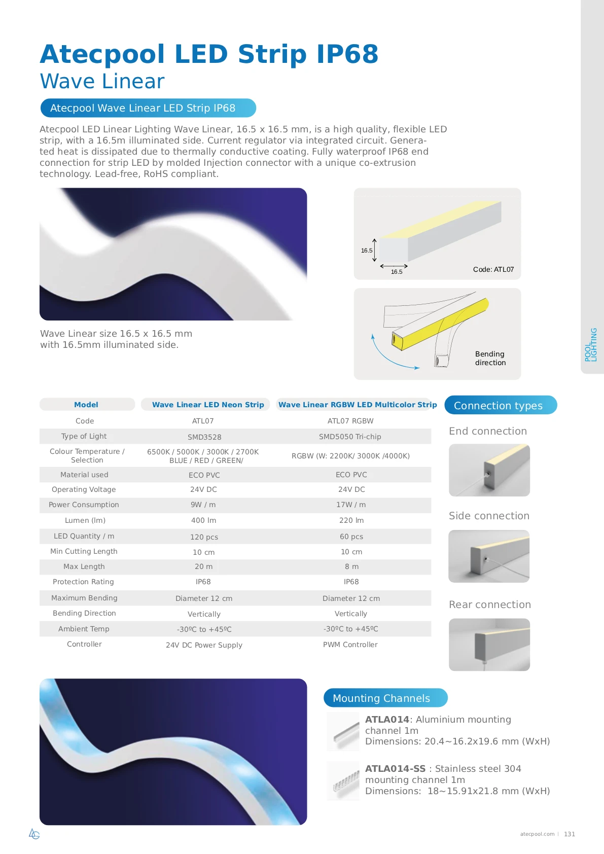 Atecpool LED Linear Lighting Curve Linear, 21 x 11.5 mm, is a high-quality, flexible LED strip, with an 11.5 mm illuminated side. Current regulator via integrated circuit. Generated heat is dissipated due to thermally conductive coating. Fully waterproof IP68 end connection for strip LED by molded Injection connector with a unique co-extrusion technology. Lead-free, RoHS compliant.