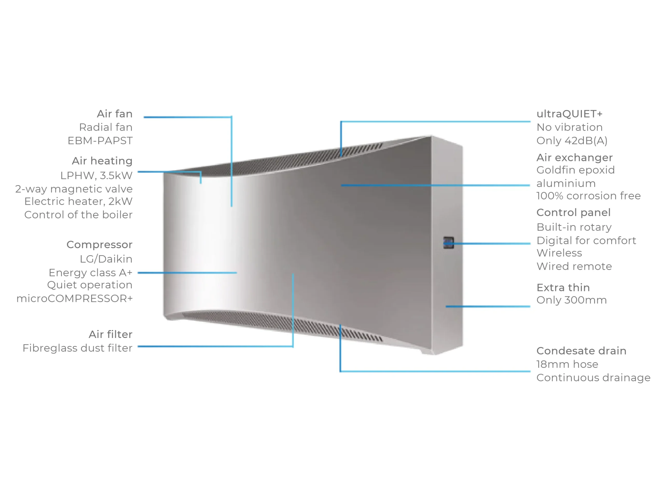 Atecpool Dry Series dehumidifier is made to provide up to 3.5 times more energy than it consumes keeping its heat recovery system at its best. Wide color options with metal cabinet.