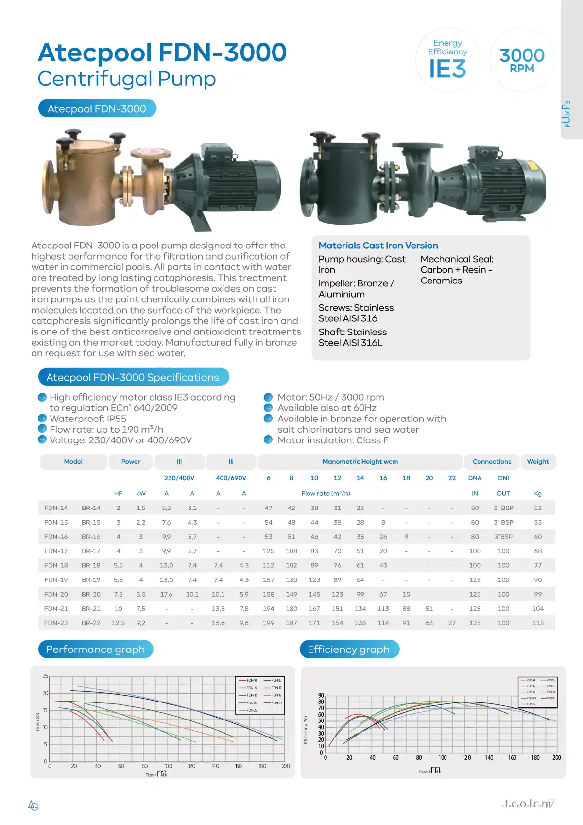 Atecpool FDN-3000 is a pool pump designed to offer the highest performance for the filtration and purification of water in commercial pools. All parts in contact with water are treated by long-lasting cathode protection. This treatment prevents the formation of troublesome oxides on cast iron pumps as the paint chemically combines with all iron molecules located on the surface of the workpiece. The Cataphoresis significantly prolongs the life of cast iron and is one of the best anticorrosive and antioxidant treatments existing on the market today. Manufactured fully in bronze on request for use with sea water.
