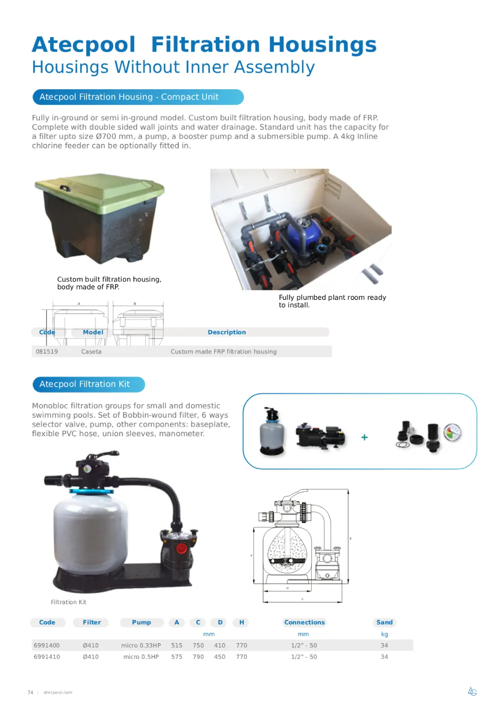 Fully in-ground or semi-in-ground model. Custom-built filtration housing, body made of FRP. Complete with double-sided wall joints and water drainage. The standard unit has the capacity for a filter up to Ø700 mm, a pump, a booster pump, and a submersible pump. A 4kg Inline chlorine feeder can be optionally fitted in.