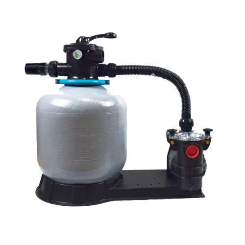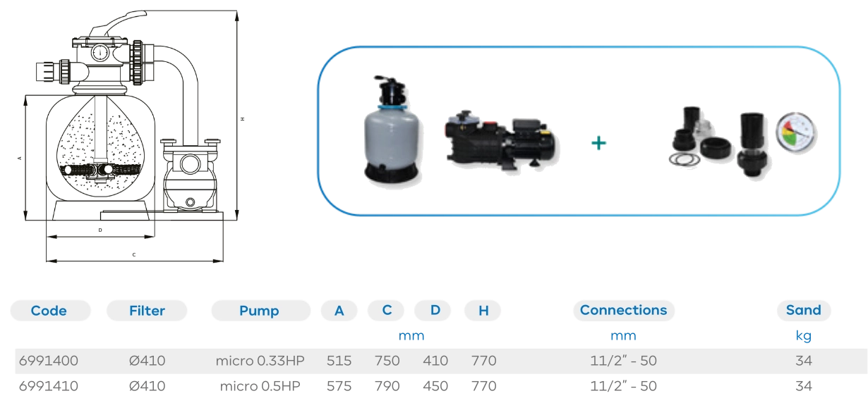 Monobloc filtration groups for small and domestic swimming pools. Set of Bobbin-wound filter, 6 ways selector valve, pump, other components: baseplate, flexible PVC hose, union sleeves, manometer.