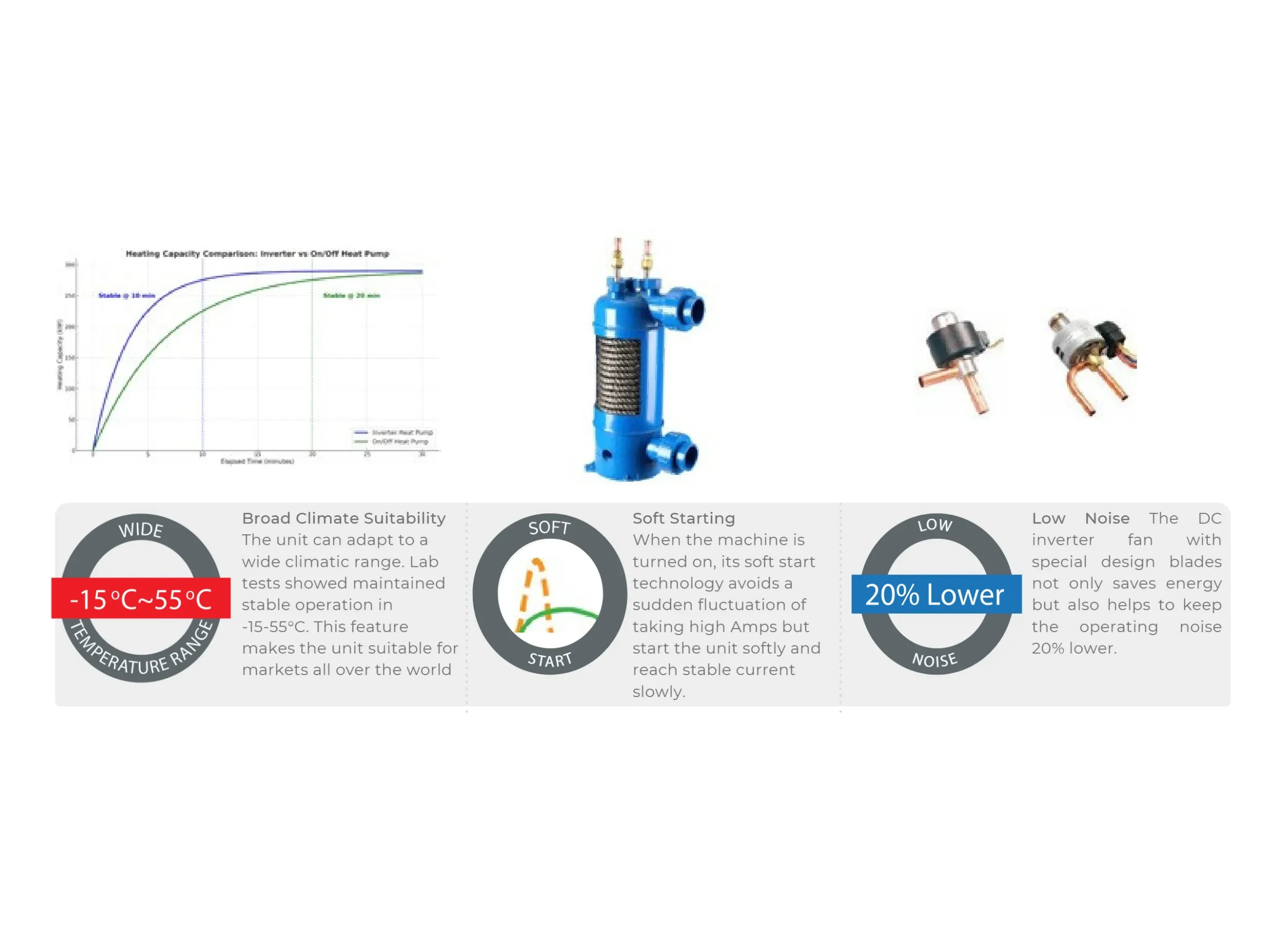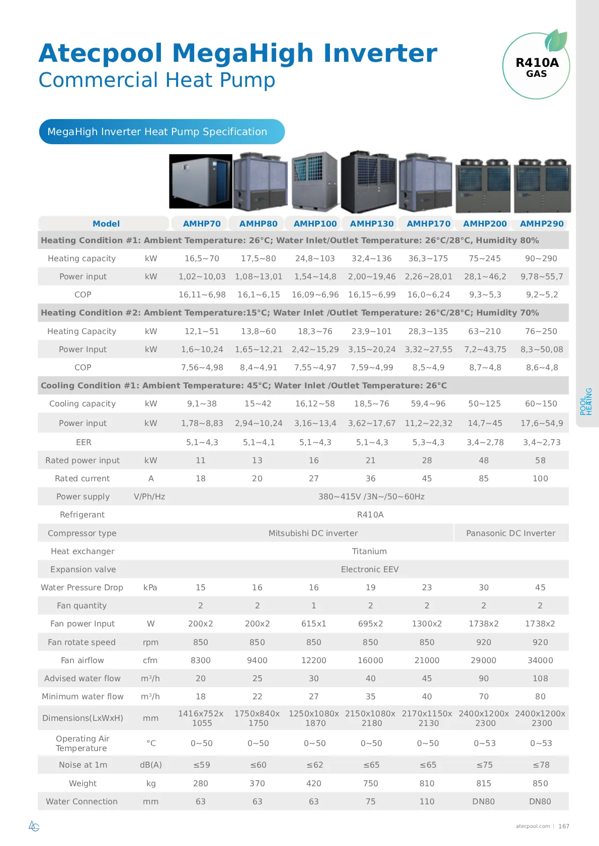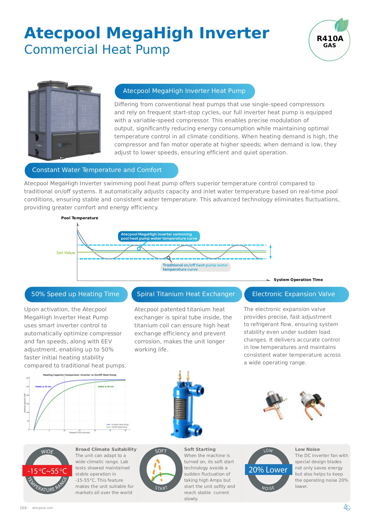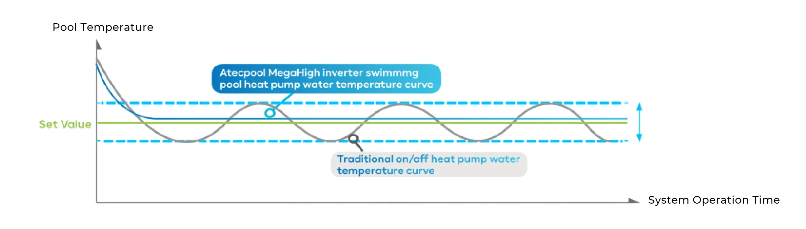 Atecpool MegaHigh Inverter swimming pool heat pump offers superior temperature control compared to traditional on/off systems. It automatically adjusts capacity and inlet water temperature based on real-time pool conditions, ensuring stable and consistent water temperature. This advanced technology eliminates fluctuations, providing greater comfort and energy efficiency.