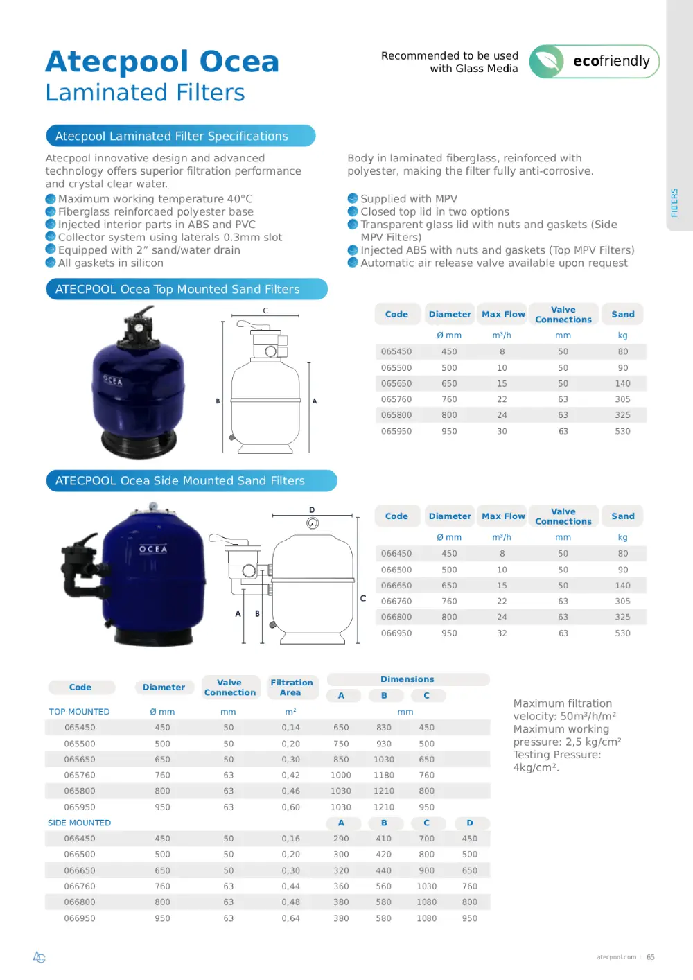 Atecpool’s innovative design and advanced technology offer superior filtration performance and crystal clear water. The body is laminated fiberglass, reinforced with polyester, making the filter fully anti-corrosive.