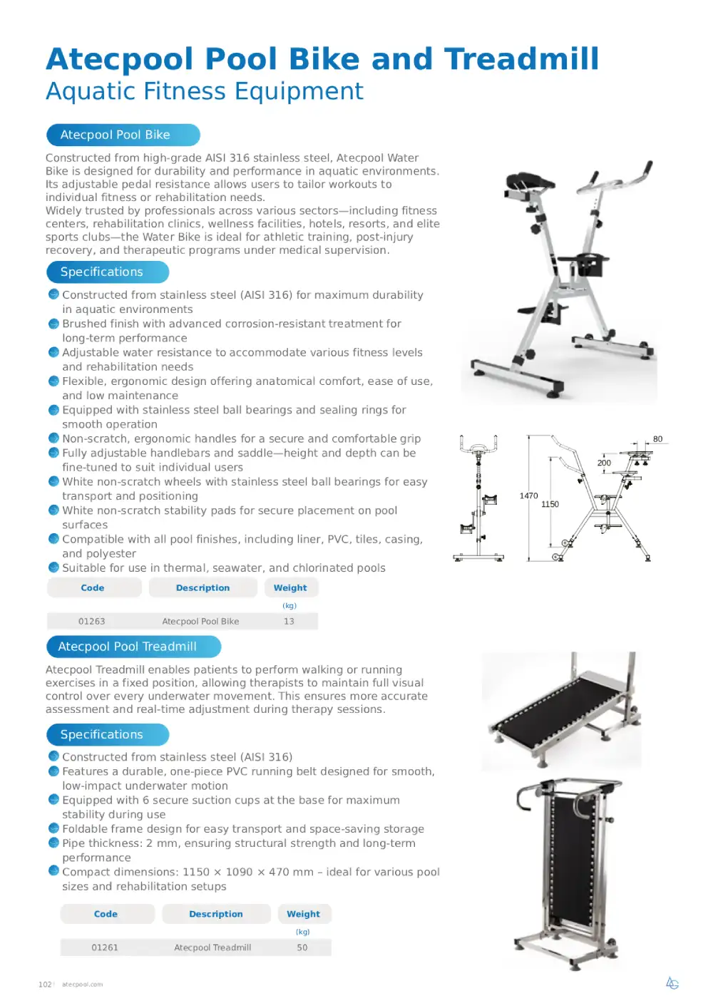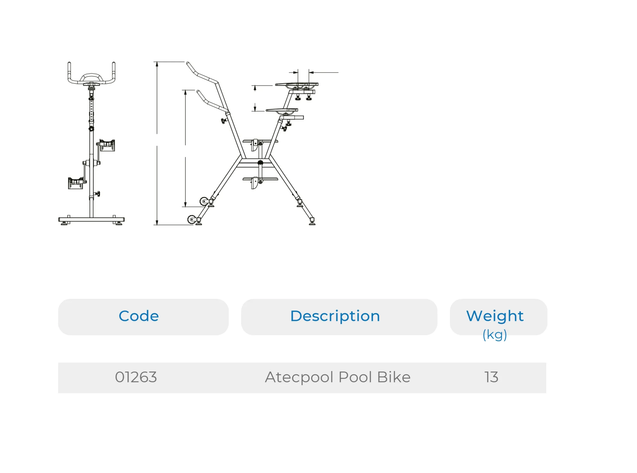 Constructed from high-grade AISI 316 stainless steel, Atecpool Water Bike is designed for durability and performance in aquatic environments. Its adjustable pedal resistance allows users to tailor workouts to individual fitness or rehabilitation needs. Widely trusted by professionals across various sectors—including fitness centers, rehabilitation clinics, wellness facilities, hotels, resorts, and elite sports clubs—the Water Bike is ideal for athletic training, post-injury recovery, and therapeutic programs under medical supervision.