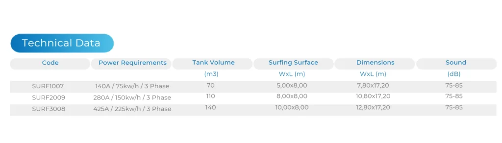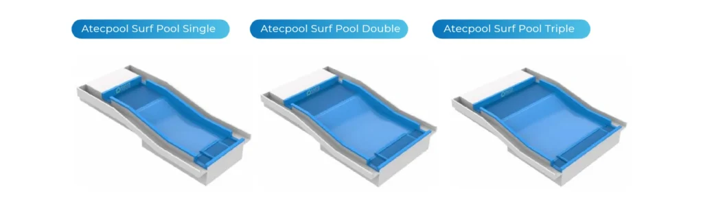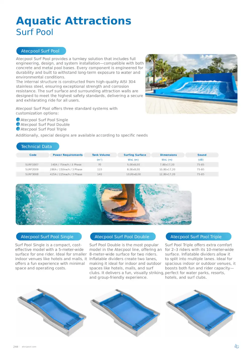 Atecpool Surf Pool provides a turnkey solution that includes full engineering, design, and system installation—compatible with both concrete and metal pool bases. Every component is engineered for durability and built to withstand long-term exposure to water and environmental conditions. The internal structure is constructed from high-quality AISI 304 stainless steel, ensuring exceptional strength and corrosion resistance. The surf surface and surrounding attraction walls are designed to meet the highest safety standards, delivering a secure and exhilarating ride for all users.