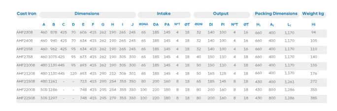 - Cast iron version: pump body, pre-filter, coupling in cast iron