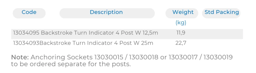 Includes 4 posts in Stainless Steel AISI 316, cord and thick PVC flags (4 flags every meter). No anchors included. Available in two different widths. Height 1800 mm. Ø43 mm posts for pool width upto 12.5 m and Ø48 mm posts for pool width above 12.5 m.