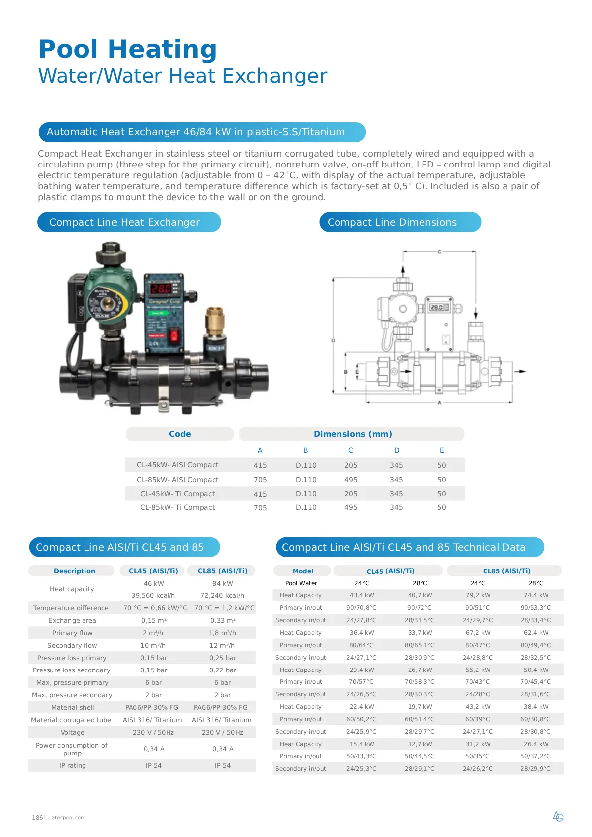 Water/water heat exchanger with corrugated coiled tubing in cross flow, stainless steel or titaniumcorrugated coiled tubing, offers high energy efficiency. The plastic shell can endure high pressure and is corrosion resistant. The individual components are sealed with silicon gaskets and ensure longevity of the whole heat exchanger. Like all coiled tubing heat Exchanger, they must be integrated in the bathing water circuit either directly or through the bypass-system. Material shell is made of PA66/PP-30% FG.