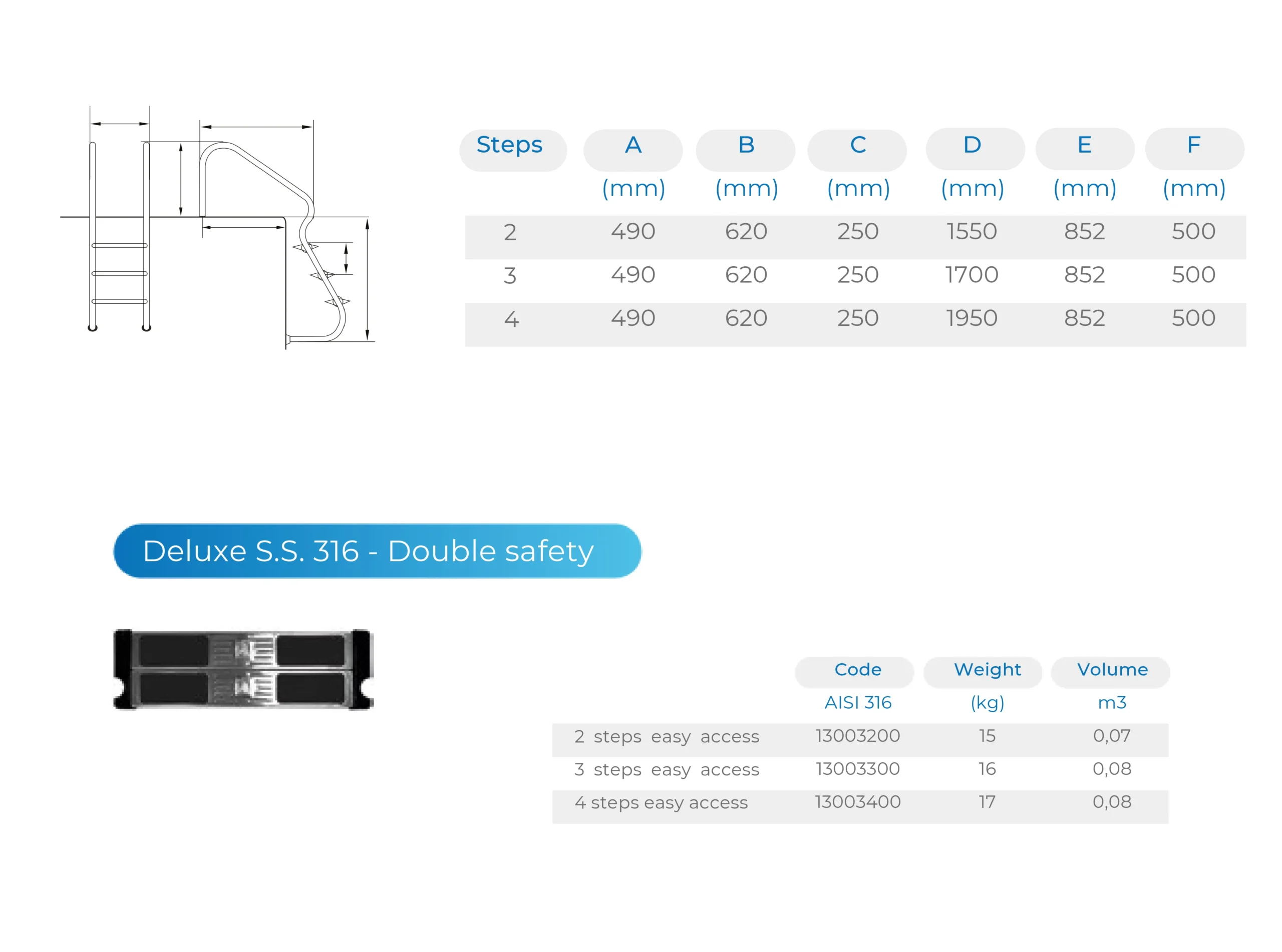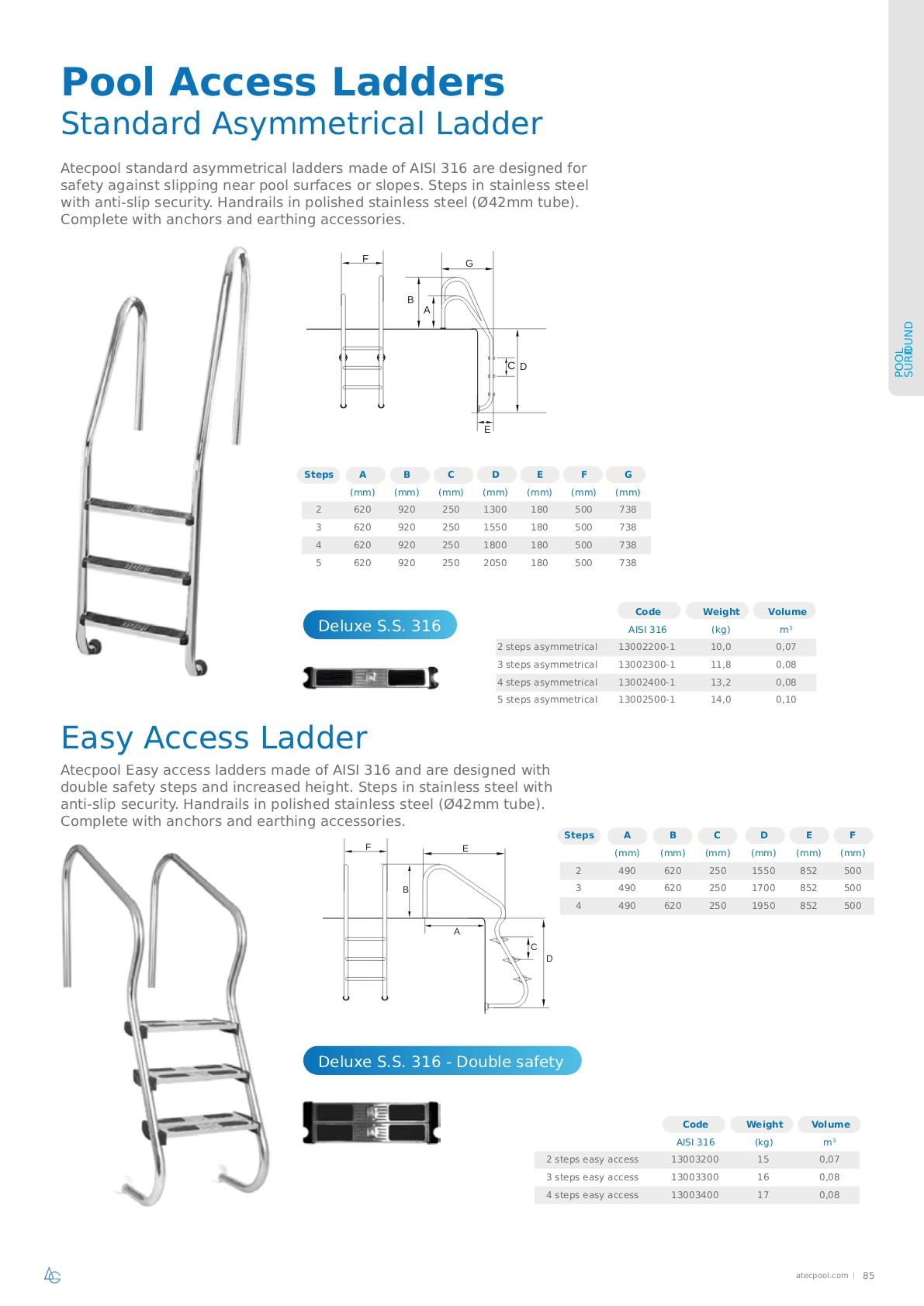 Atecpool Easy access ladders made of AISI 316 and are designed with double safety steps and increased height. Steps in stainless steel with anti-slip security. Handrails in polished stainless steel (Ø42mm tube). Complete with anchors and earthing accessories.