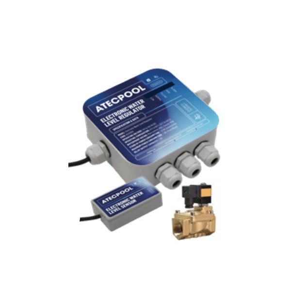 Atecpool electronic water level regulator consists of main control and sensor. The waterproof sensor (IP68) determines the water level. The electronic water level regulator operates with an input power of 24V DC and provides a 24V DC output to control the automatic filling device, such as a solenoid valve. The sensor cable can be extended upto 50m with shielded cable. The sensor is installed on a bracket and water filling is easily controlled. A damped solenoid valve for the water inlet is provided. During wave movement , the integrated time delay prevents too short switching distances.