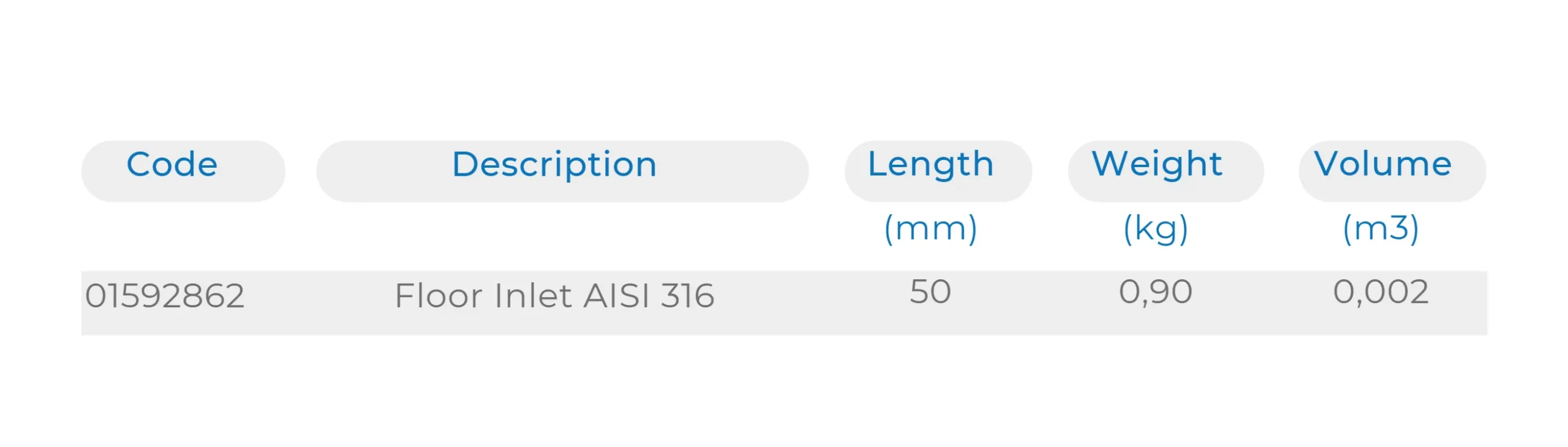 Adjustable floor return inlet made of polished stainless steel AISI 316 with 2” external thread. Max. Recommended flow rate: 14m³/h, however, flow rate can be manually regulated with the help of an adjustable screw. AISI 316L upon request.