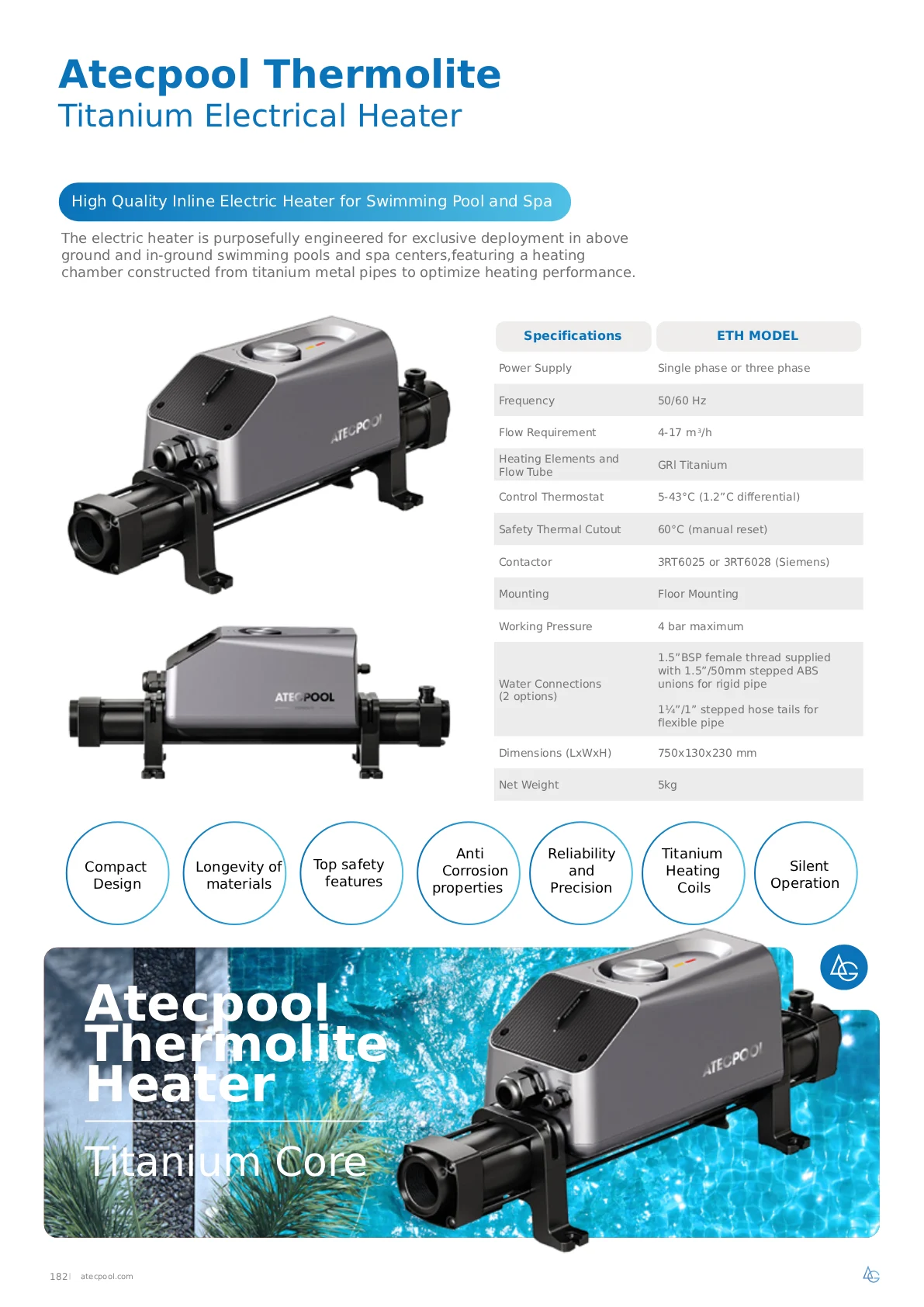The electric heater is purposefully engineered for exclusive deployment in above ground and in-ground swimming pools and spa centers,featuring a heating chamber constructed from titanium metal pipes to optimize heating performance.