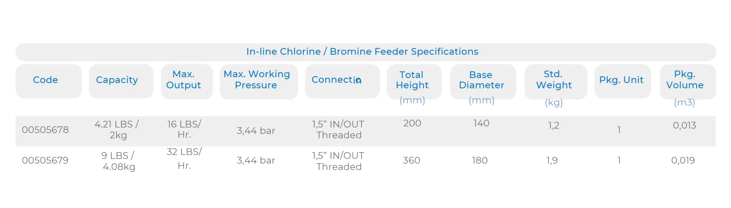 Chlorine Feeder manufactured from unalterable ABS plastic material. Fixed with double safety system cover with built-in manual air relief valve. Easy to use adjustment regulation valve and drain plug. Has mounting fixture for safe operation and correct installation. Comes with 1½”, 2” inlet and outlet threaded connection. Flow direction indicator on housing for correct installation.