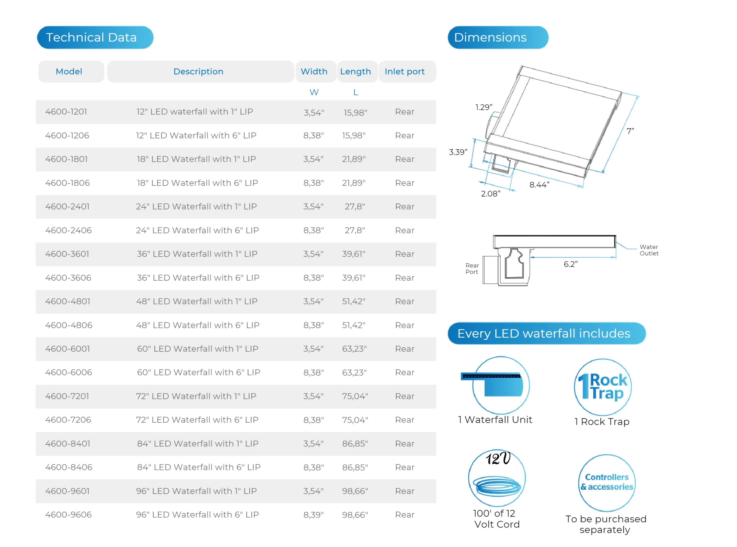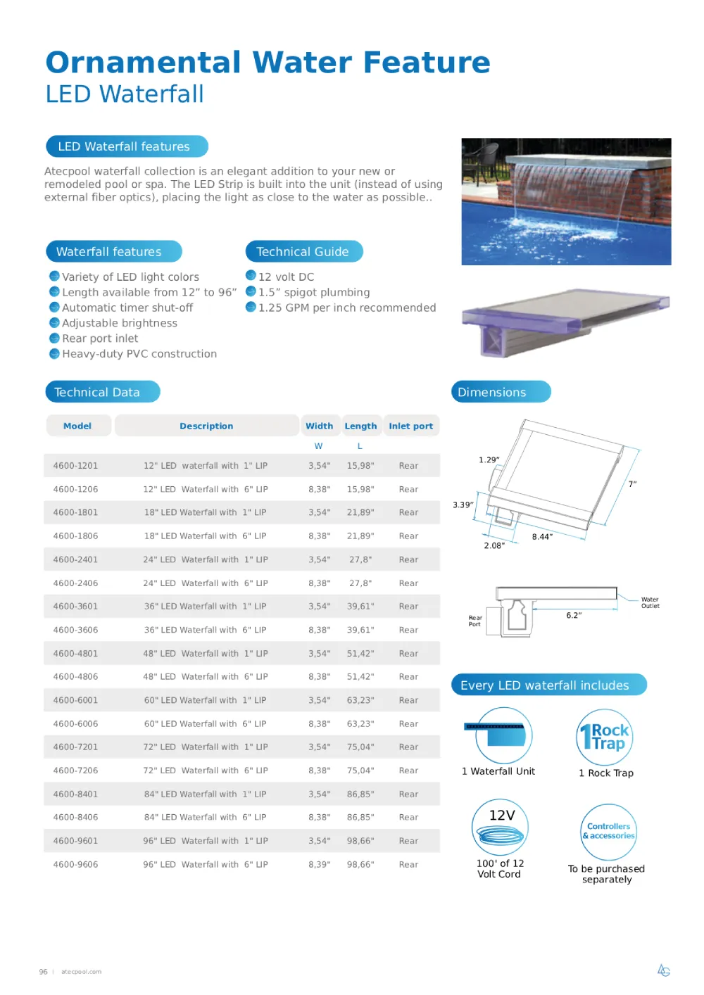 Atecpool waterfall collection is an elegant addition to your new or remodeled pool or spa. The LED Strip is built into the unit (instead of using external fiber optics), placing the light as close to the water as possible..