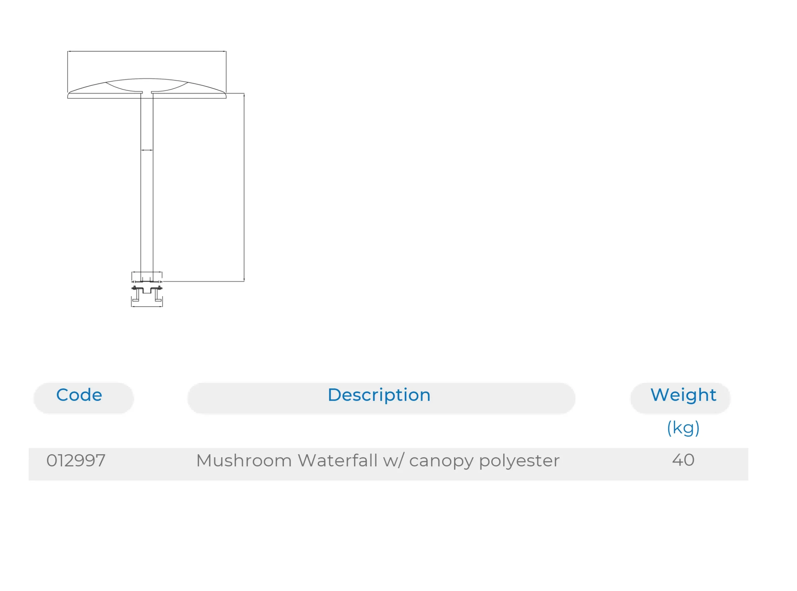 Base of umbrella made in AISI 316 and top canopy in polyester fiberglass with a polished finish (colour selection of top canopy upon choice). Mushroom water feature made of two parts: the base and the canopy. The base height will be determined by the diameter of the canopy. Our standard model base and canopy as given, special size upon request.