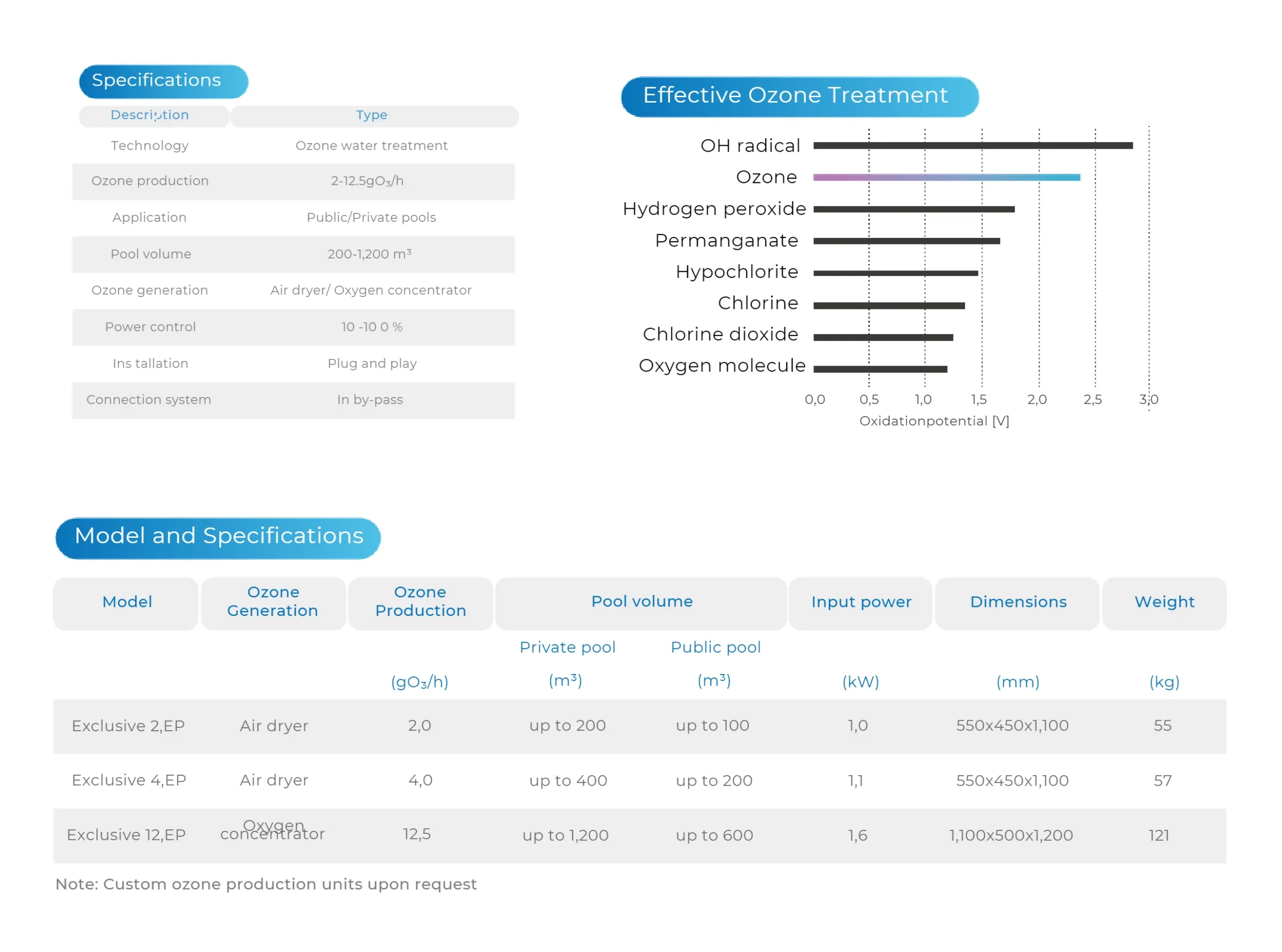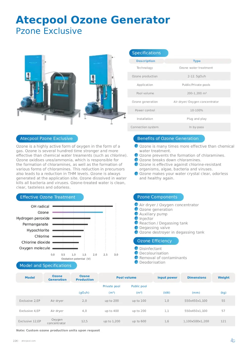Ozone is a highly active form of oxygen in the form of a gas. Ozone is several hundred time stronger and more effective than chemical water treaments (such as chlorine). Ozone oxidises urea/ammonia, which is responsible for the formation of chloramines, as well as the formation of various forms of chloramines. This reduction in precursors also leads to a reduction in THM levels. Ozone is always generated at the application site. Ozone dissolved in water kills all bacteria and viruses. Ozone-treated water is clean, clear, tasteless and odorless.