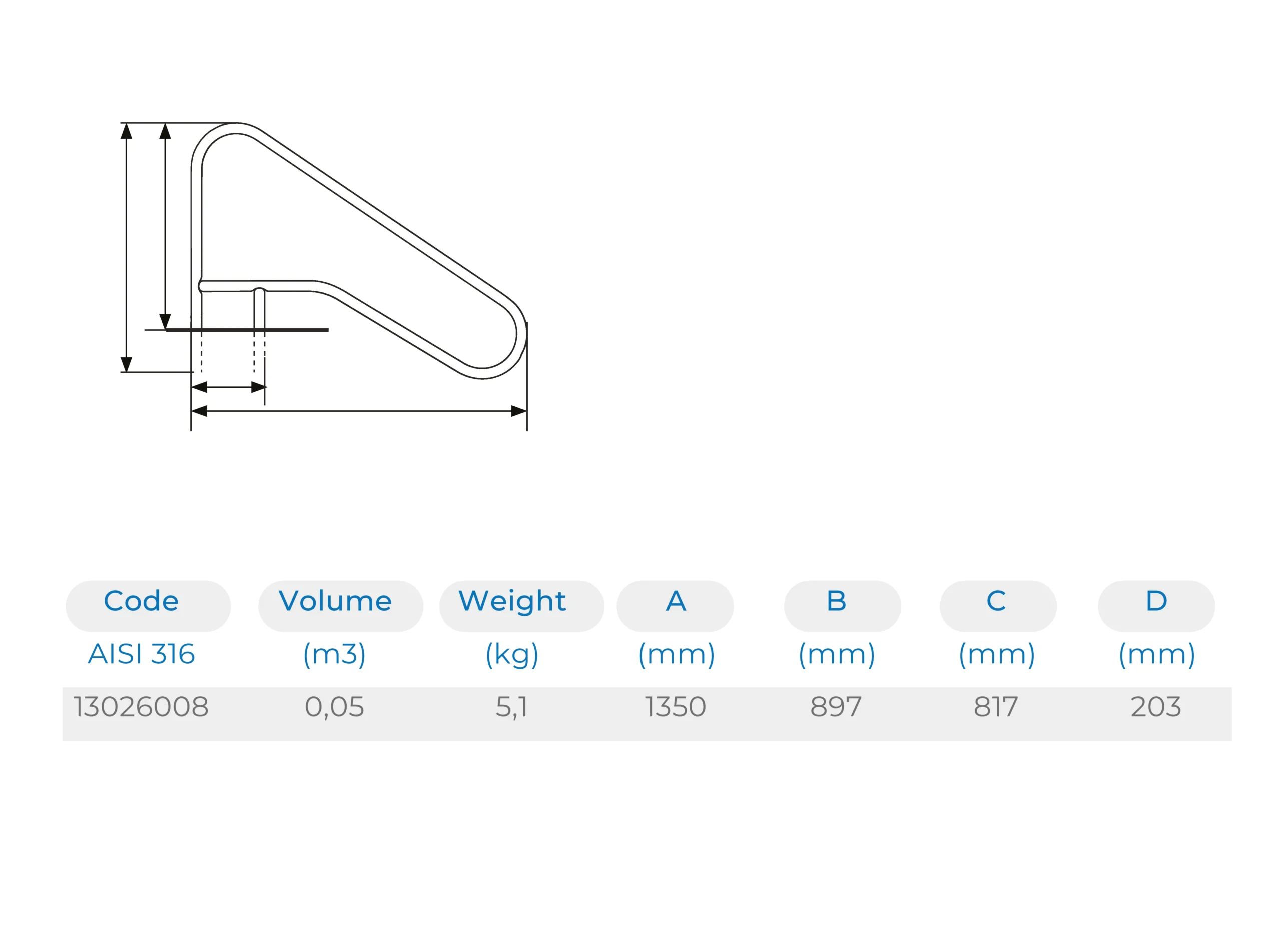 Polished AISI 316 Ø42 mm pipe bend for pool exit access. Supplied with welded flange for fixing outside the water. 1.35 m length extended for pool exit access and fixing out of the water.