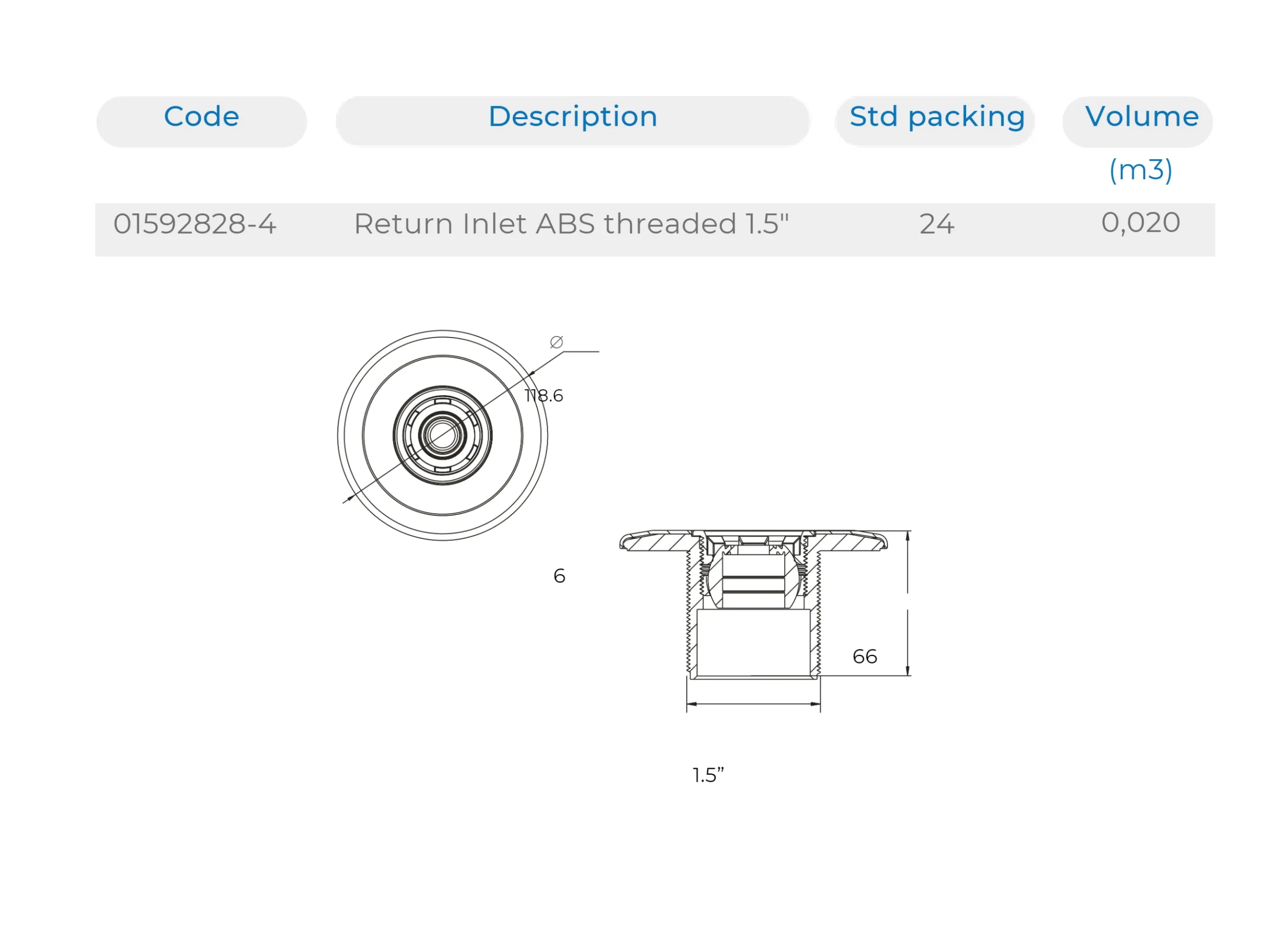 Made in white ABS with 1.5” outer connection thread for concrete pools. Installed with female threaded wall conduits. Maximum Flow: 7 m³/hr.