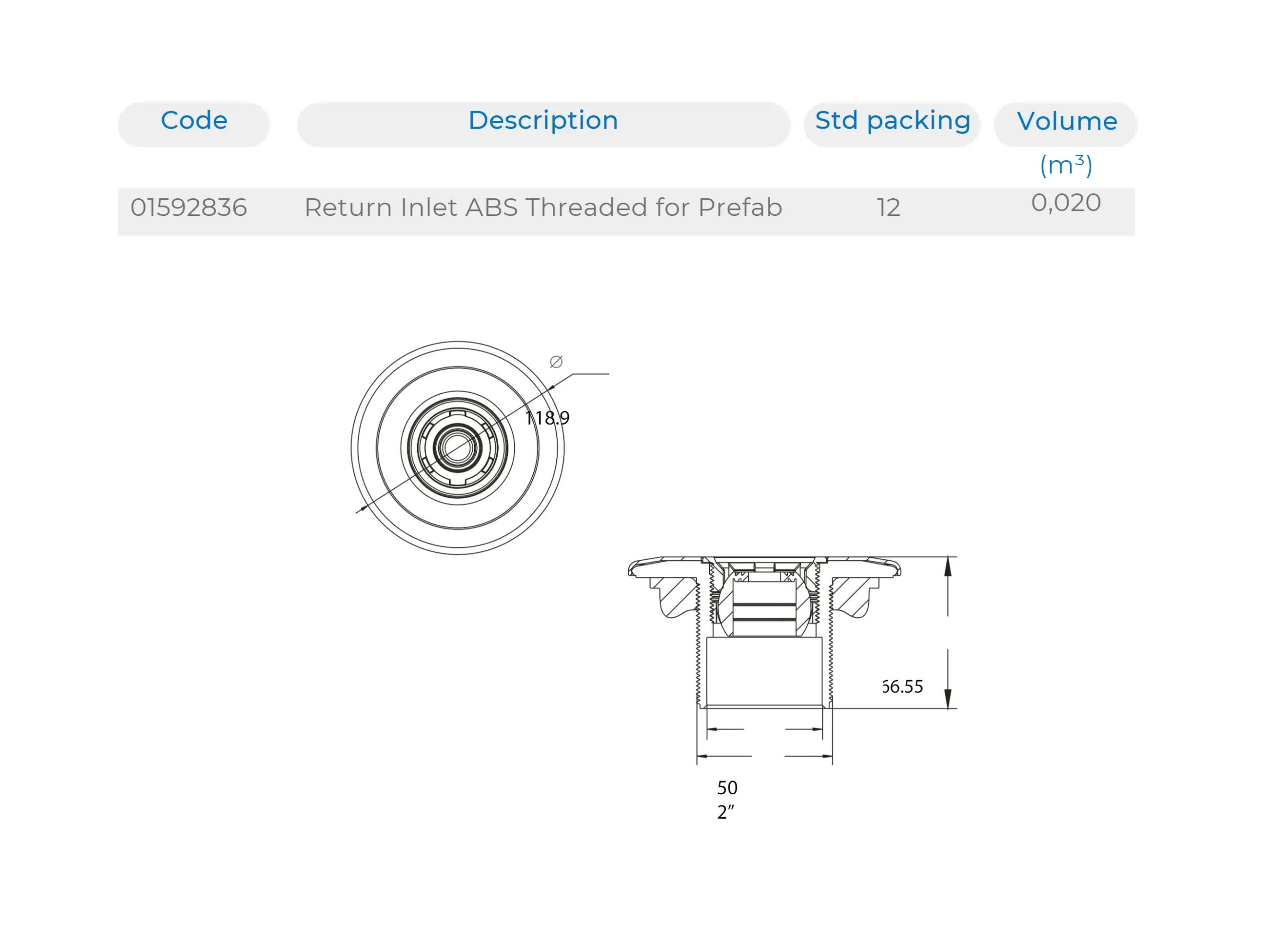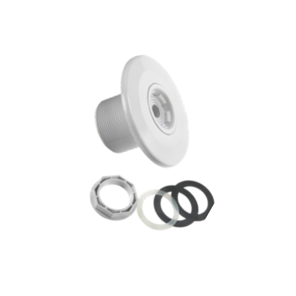 Made in white ABS with 2” outer connection thread and Ø50 mm inner wall for prefab pools. Supplied with gasket and rear nut for prefab pool fixing. Installed with female threaded wall conduits. Maximum Flow: 7 m³/hr. Recommended max. flow velocity 4 m/s.