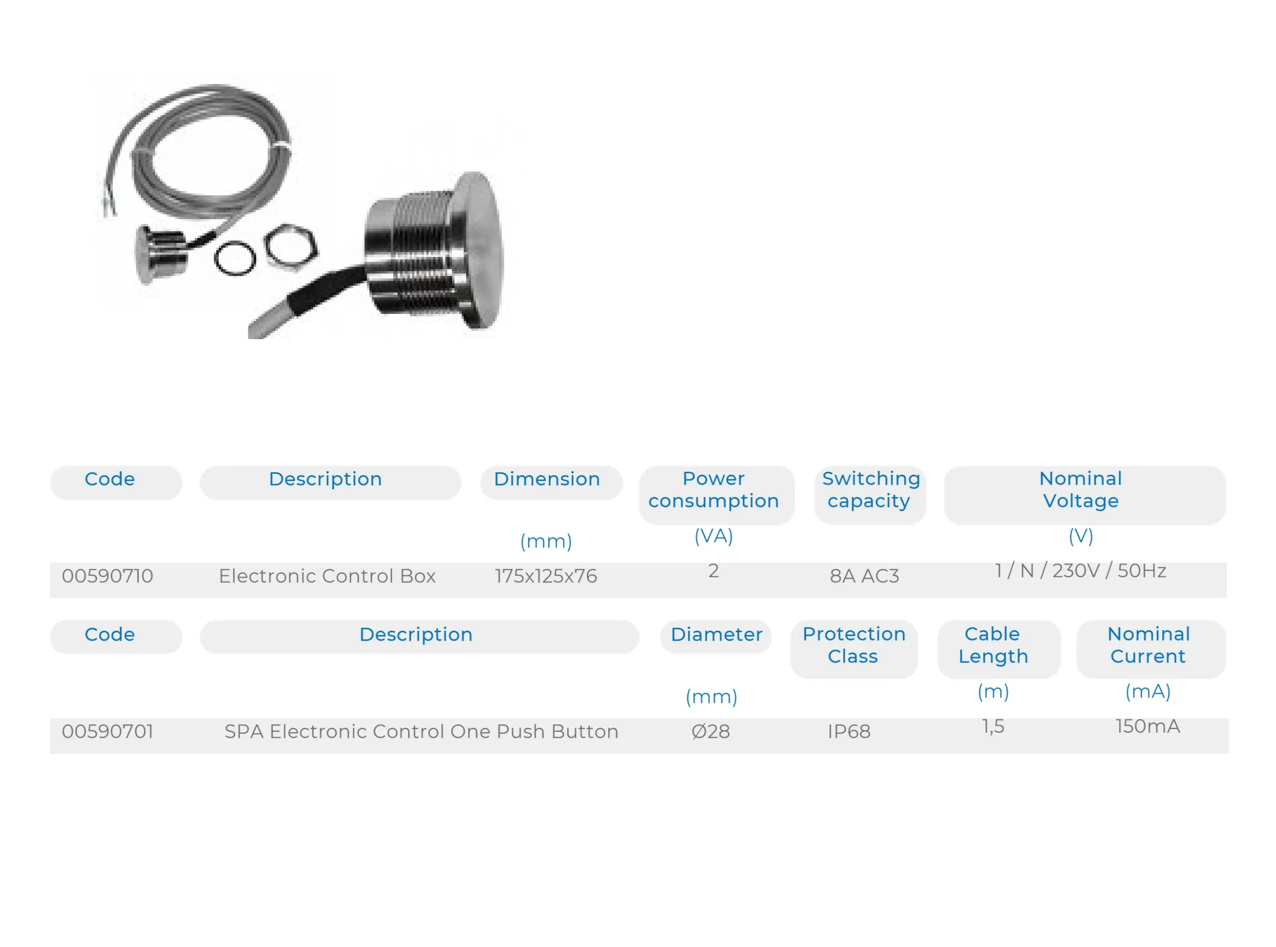 Electronic control system for SPA or whirlpool controls, switching On/Off by pressing one push button. Electronic motor protection with a setting range of 0 to 8A ensures optimum pump protection. The controller is standard equipped with an adjustable runtime limitation from 0 to 25 minutes. Supplied with single push button switch in stainless steel cast, waterproof IP68, suitable for fitting below water surface, cable length of 1.5 m.