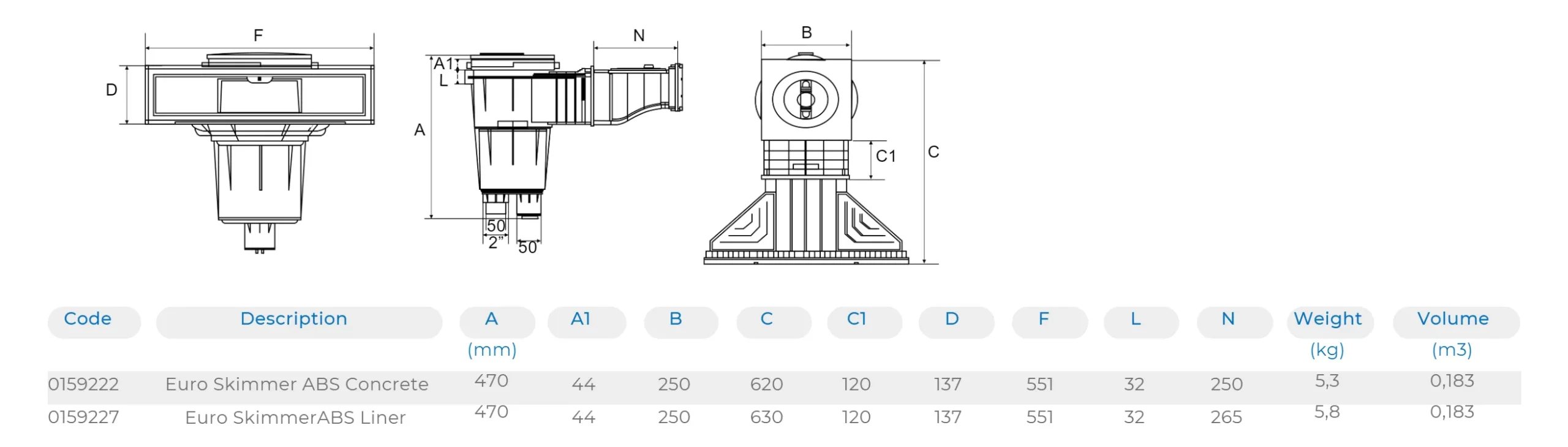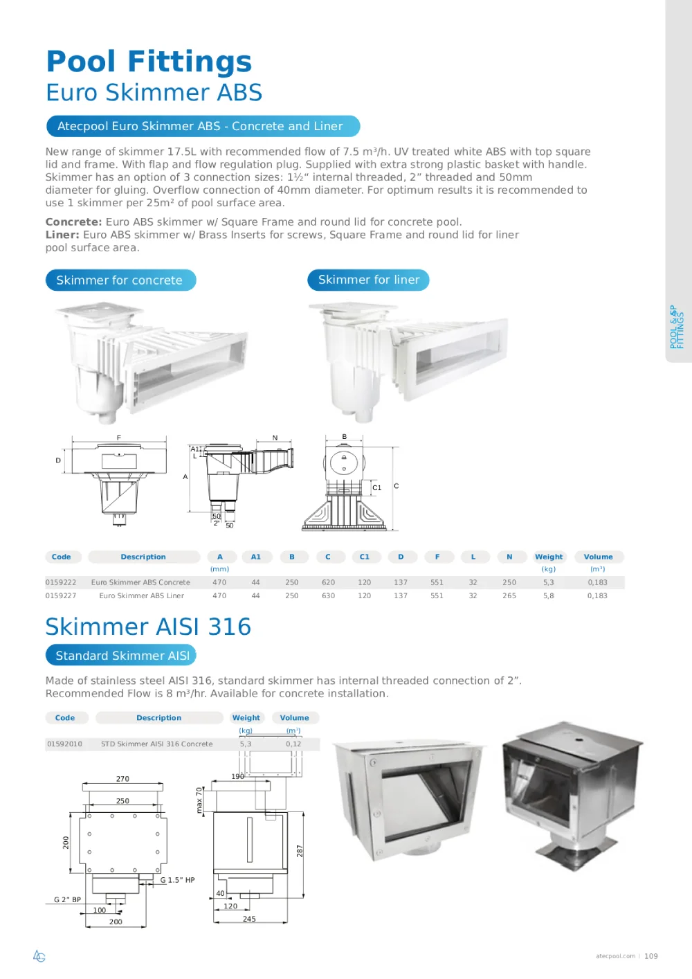 New range of skimmer 17.5L with recommended flow of 7.5 m³/h. UV treated white ABS with top square lid and frame. With flap and flow regulation plug. Supplied with extra strong plastic basket with handle. Skimmer has an option of 3 connection sizes: 11/2“ internal threaded, 2” threaded and 50mm diameter for gluing. Overflow connection of 40mm diameter. For optimum results it is recommended to use 1 skimmer per 25m² of pool surface area. Made of stainless steel AISI 316, standard skimmer has internal threaded connection of 2”. Recommended Flow is 8 m³/hr. Available for concrete installation. Concrete: Euro ABS skimmer w/ Square Frame and round lid for concrete pool. Liner: Euro ABS skimmer w/ Brass Inserts for screws, Square Frame and round lid for liner pool surface area.