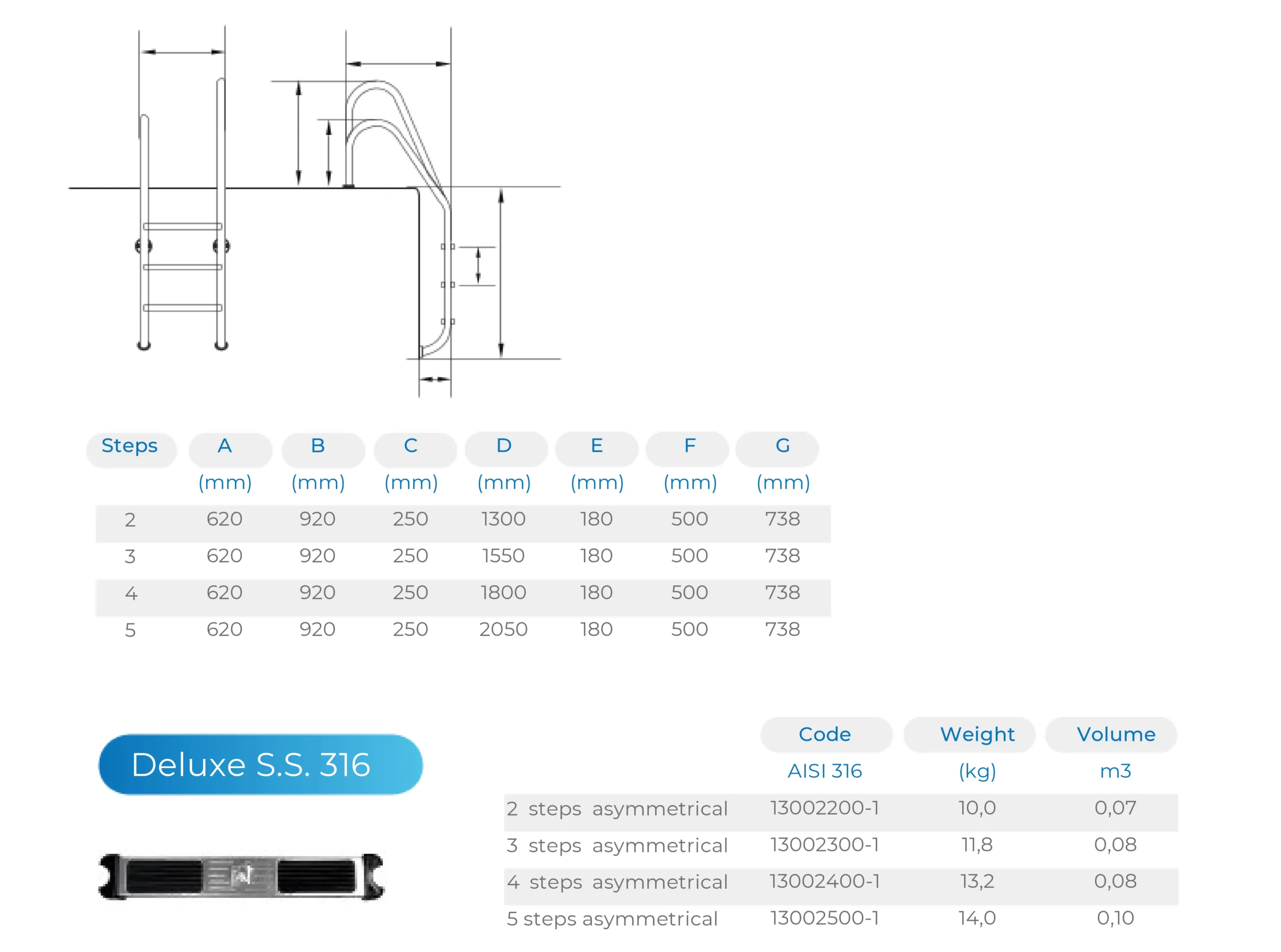 Atecpool standard asymmetrical ladders made of AISI 316 are designed for safety against slipping near pool surfaces or slopes. Steps in stainless steel with anti-slip security. Handrails in polished stainless steel (Ø42mm tube). Complete with anchors and earthing accessories.