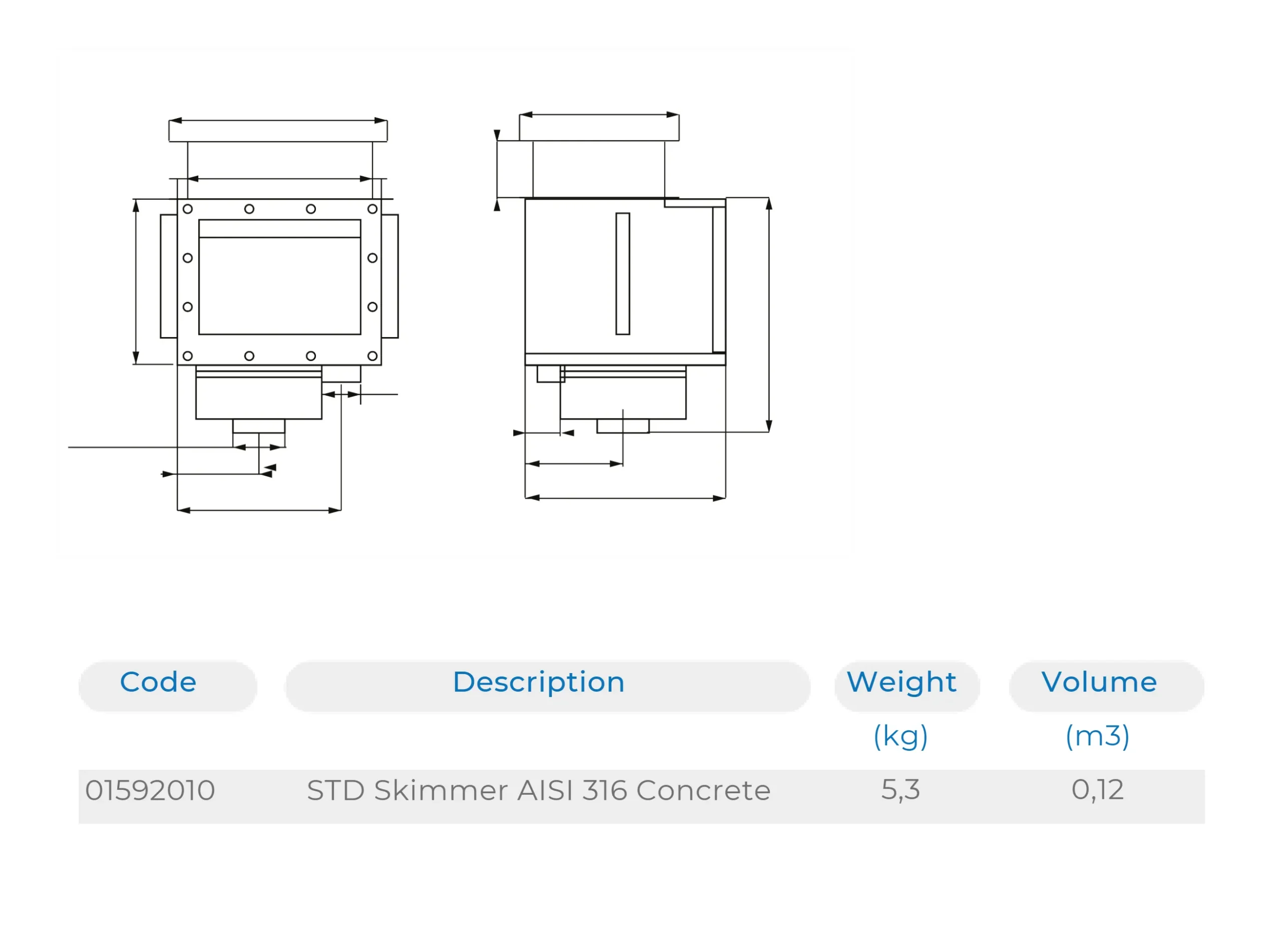 Made of stainless steel AISI 316, standard skimmer has internal threaded connection of 2”. Recommended Flow is 8 m³/hr. Available for concrete installation