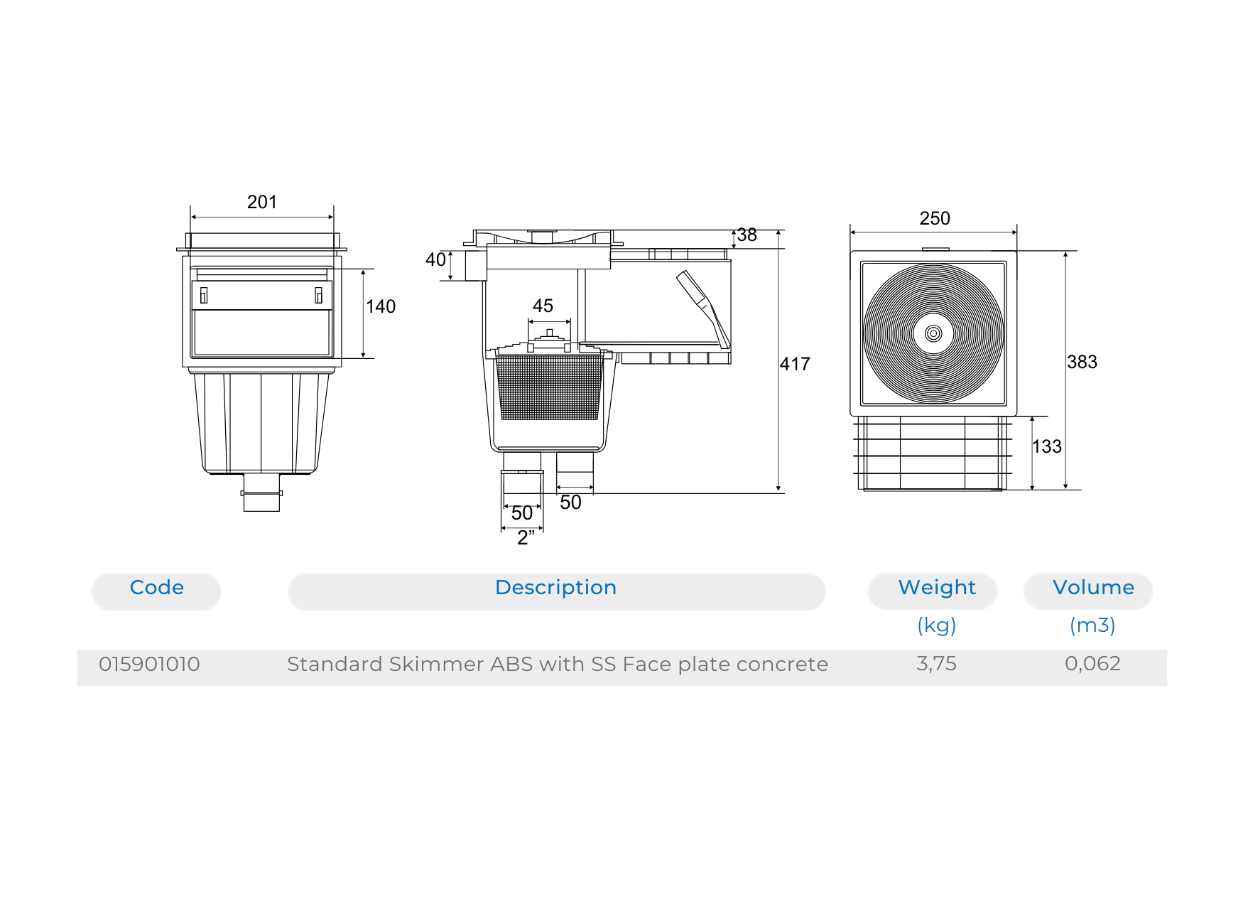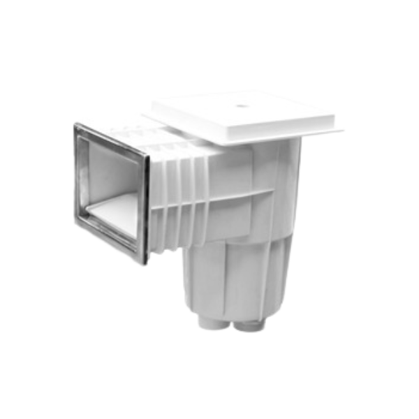 Manufactured in UV treated white ABS with SS face plate in AISI 316. Supplied with top square lid and frame. With flap and flow regulation plug. Supplied with extra strong plastic basket with handle. Skimmer has 3 optional connections for bottom suction. 1 1/2” internal thread, 2 “ outer thread and Ø50 mm inner wall for gluing. Recommended flow is 5m³/h. For optimum results it is recommended to use 1 skimmer per 25m² of pool surface area. The skimmer suction can also be used for vacuum cleaning the pool floor