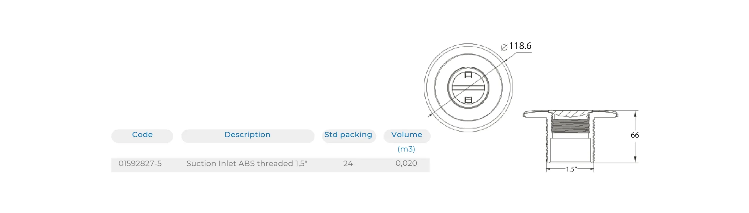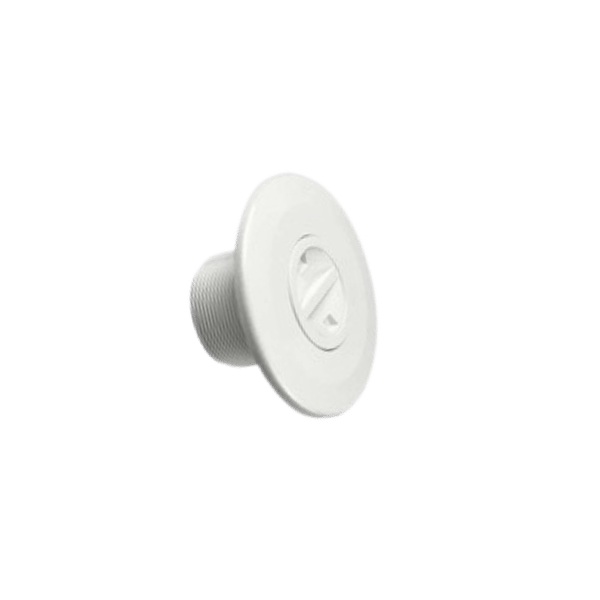 Made in white ABS with 1.5” outer connection threaded for concrete pools. Installed with female threaded wall conduits. Supplied with threaded plug of 11/2”. Maximum pressure: 6 Bar.