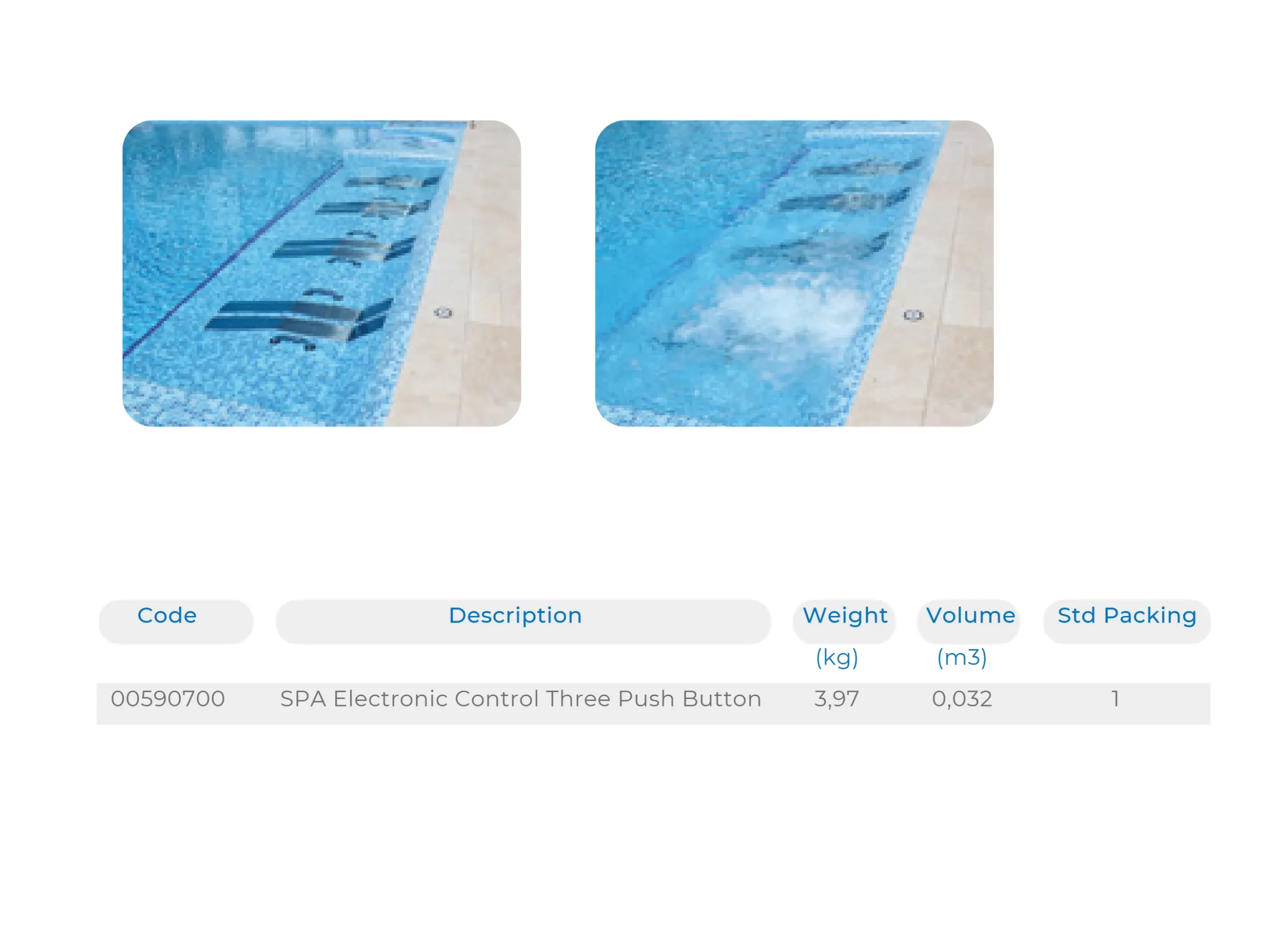 SPA control unit consist of 3 push button deck mountable fitting and electronic control box. Three Push Button fitting is mounted on the deck of the SPA and is connected to the electronic control box enabling users to stop / start massage functions, underwater lighting etc. 3 push button fitting made in white plastic, also available with S.S. trim on request , protection class IP65. Standard cable length 15 meters. Electronic control box – Input 230V / Power 1750W.