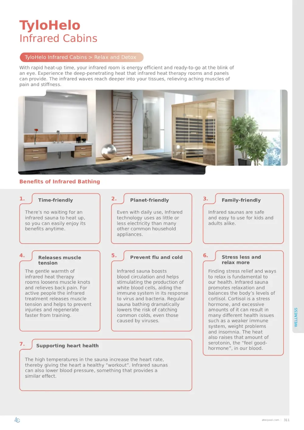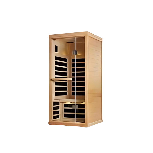 topped with easy-fit ceiling panel. Prefabricated wall panels, benches and floor in clear Hemlock—for a sauna with “furniture quality”. The exterior surfaces are finished with biodegradable wood treatment—for a more luxurious look and for ease of maintenance. The CarbonFlex® infrared heaters, integral with wall panels, with heater surface area and wattage designed to give even, enveloping heat on all sides. Custom built infra room panels are controlled using Elite Control panel with the relay box Commercial Lite.
