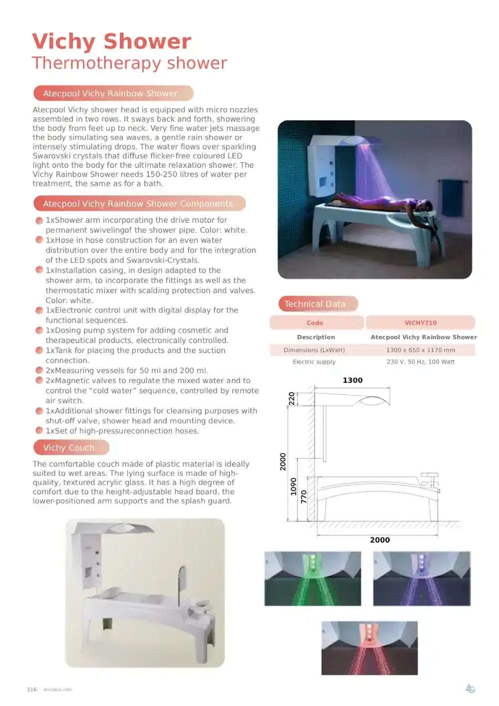 The comfortable couch made of plastic material is ideally suited to wet areas. The lying surface is made of high-quality, textured acrylic glass. It has a high degree of comfort due to the height-adjustable headboard, the lower-positioned arm supports, and the splash guard.
